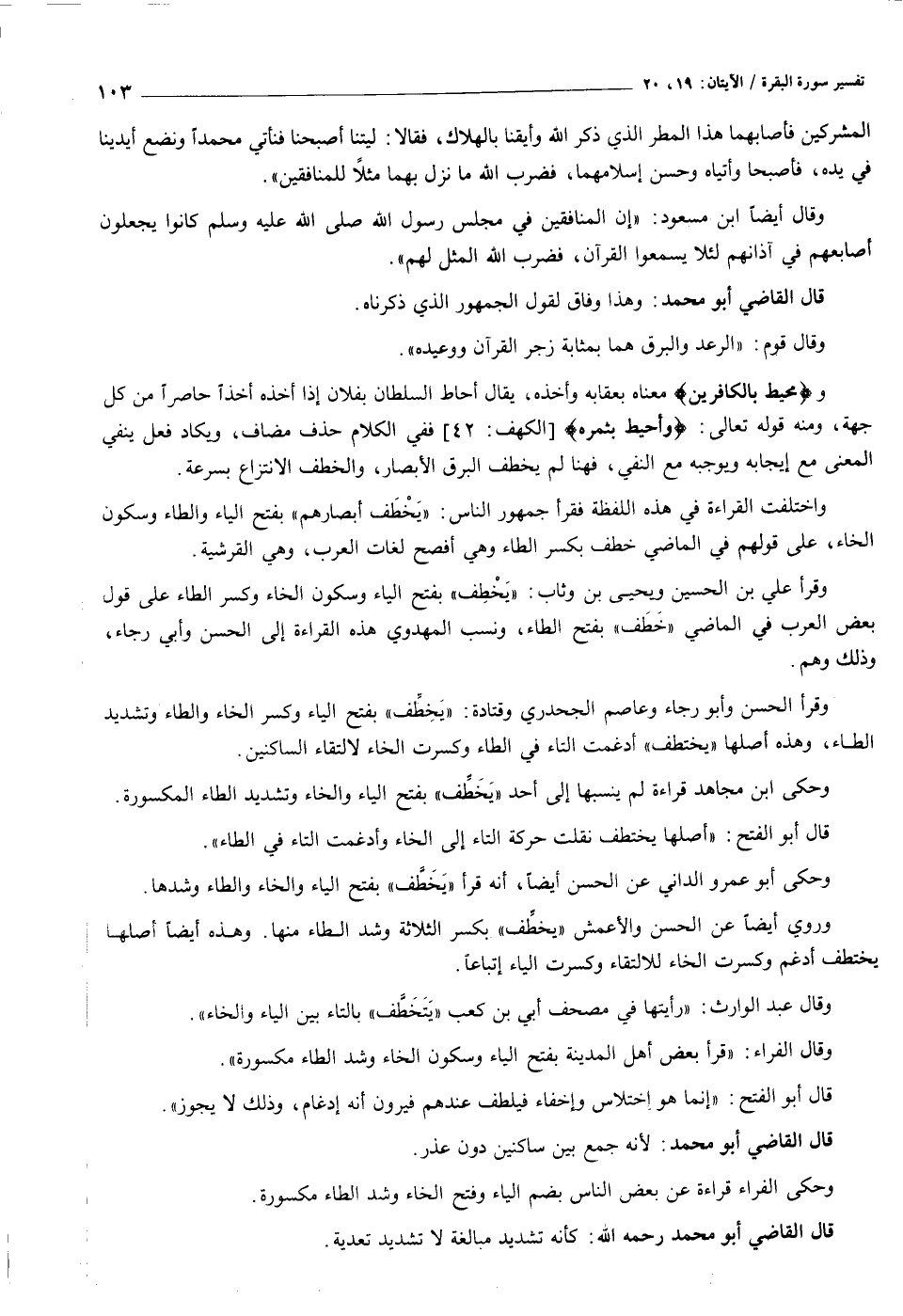 واختلفت القراءة في هذه اللفظة فقرأ جمهور الناس: «يخطف أبصارهم» بفتح الياء والطاء وسكون الخاء، على قولهم في الماضي خطف بكسر الطاء وهي أفصح لغات العرب، وهي القرشية.