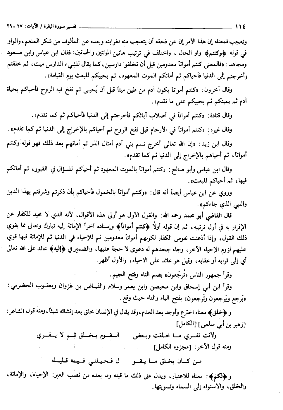 وتعجب فمعناه إن هذا الأمر إن عن فحقه أن يتعجب منه لغرابته وبعده عن المألوف من شكر المنعم، والواو في قوله وَكُنْتُمْ واو الحال، واختلف في ترتيب هاتين الموتتين والحياتين: فقال ابن عباس وابن مسعود ومجاهد: «فالمعنى كنتم أمواتا معدومين قبل أن تخلقوا دارسين، كما يقال للشيء الدارس ميت، ثم خلقتم وأخرجتم إلى الدنيا فأحياكم ثم أماتكم الموت المعهود، ثم يحييكم للبعث يوم القيامة» .