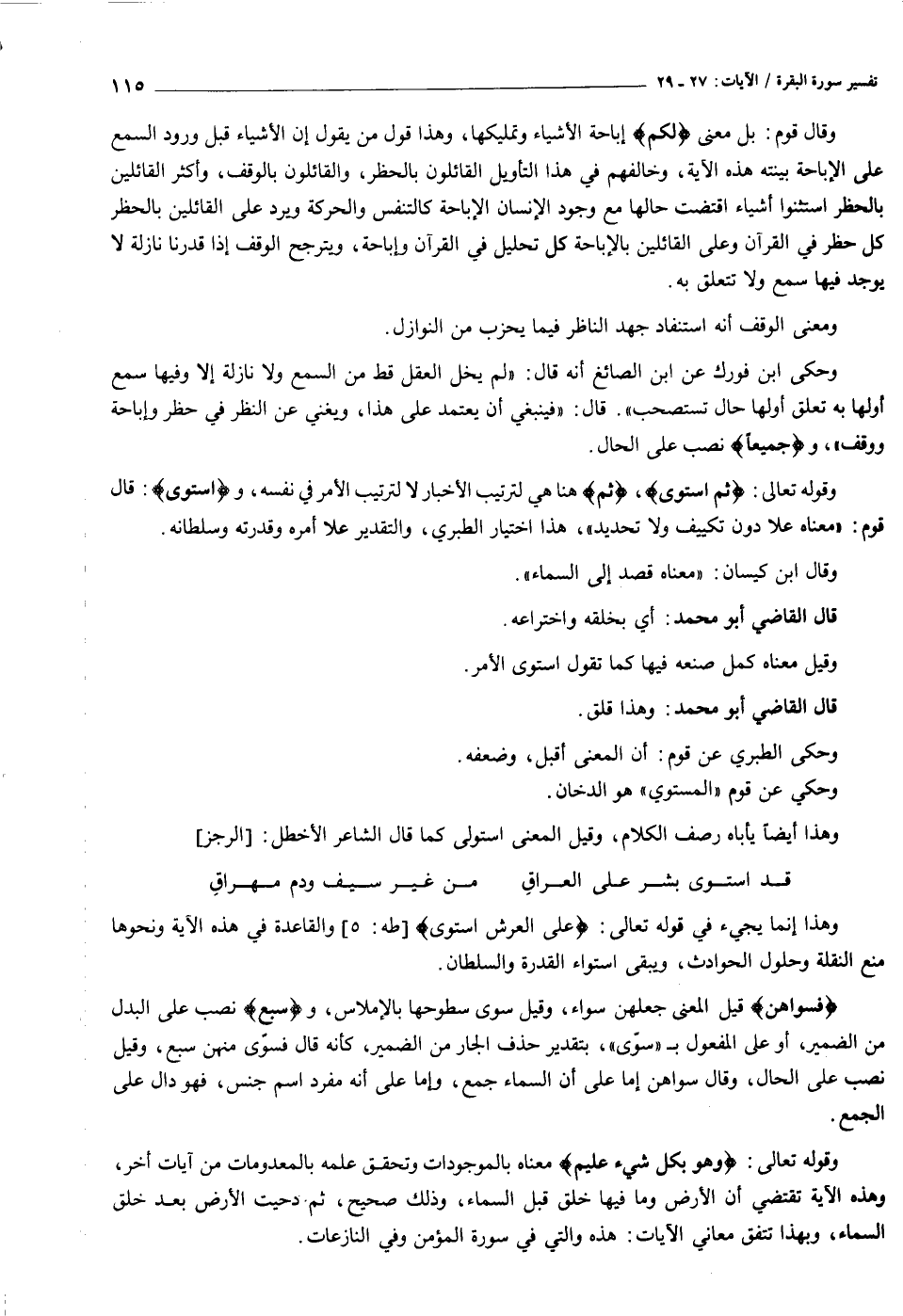 وقوله تعالى: ثُمَّ اسْتَوى، ثُمَّ هنا هي لترتيب الأخبار لا لترتيب الأمر في نفسه، واسْتَوى: قال قوم: «معناه علا دون تكييف ولا تحديد» ، هذا اختيار الطبري، والتقدير علا أمره وقدرته وسلطانه.