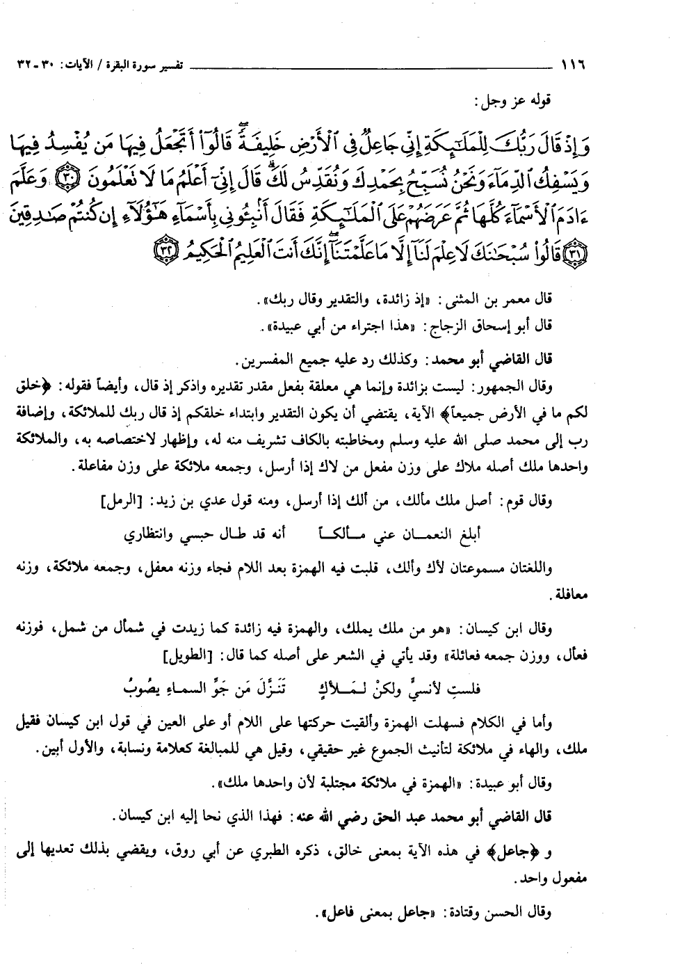 وَإِذْ قالَ رَبُّكَ لِلْمَلائِكَةِ إِنِّي جاعِلٌ فِي الْأَرْضِ خَلِيفَةً قالُوا أَتَجْعَلُ فِيها مَنْ يُفْسِدُ فِيها وَيَسْفِكُ الدِّماءَ وَنَحْنُ نُسَبِّحُ بِحَمْدِكَ وَنُقَدِّسُ لَكَ قالَ إِنِّي أَعْلَمُ ما لا تَعْلَمُونَ (٣٠) وَعَلَّمَ آدَمَ الْأَسْماءَ كُلَّها ثُمَّ عَرَضَهُمْ عَلَى الْمَلائِكَةِ فَقالَ أَنْبِئُونِي بِأَسْماءِ هؤُلاءِ إِنْ كُنْتُمْ صادِقِينَ (٣١) قالُوا سُبْحانَكَ لا عِلْمَ لَنا إِلاَّ ما عَلَّمْتَنا إِنَّكَ أَنْتَ الْعَلِيمُ الْحَكِيمُ (٣٢)