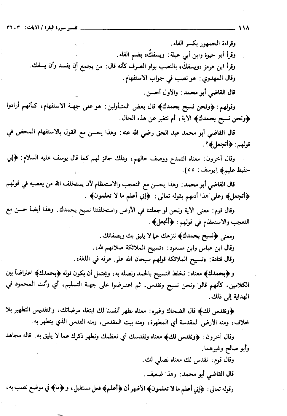 وقولهم: وَنَحْنُ نُسَبِّحُ بِحَمْدِكَ قال بعض المتأولين: هو على جهة الاستفهام، كأنهم أرادوا وَنَحْنُ نُسَبِّحُ بِحَمْدِكَ الآية، أم نتغير عن هذه الحال.
