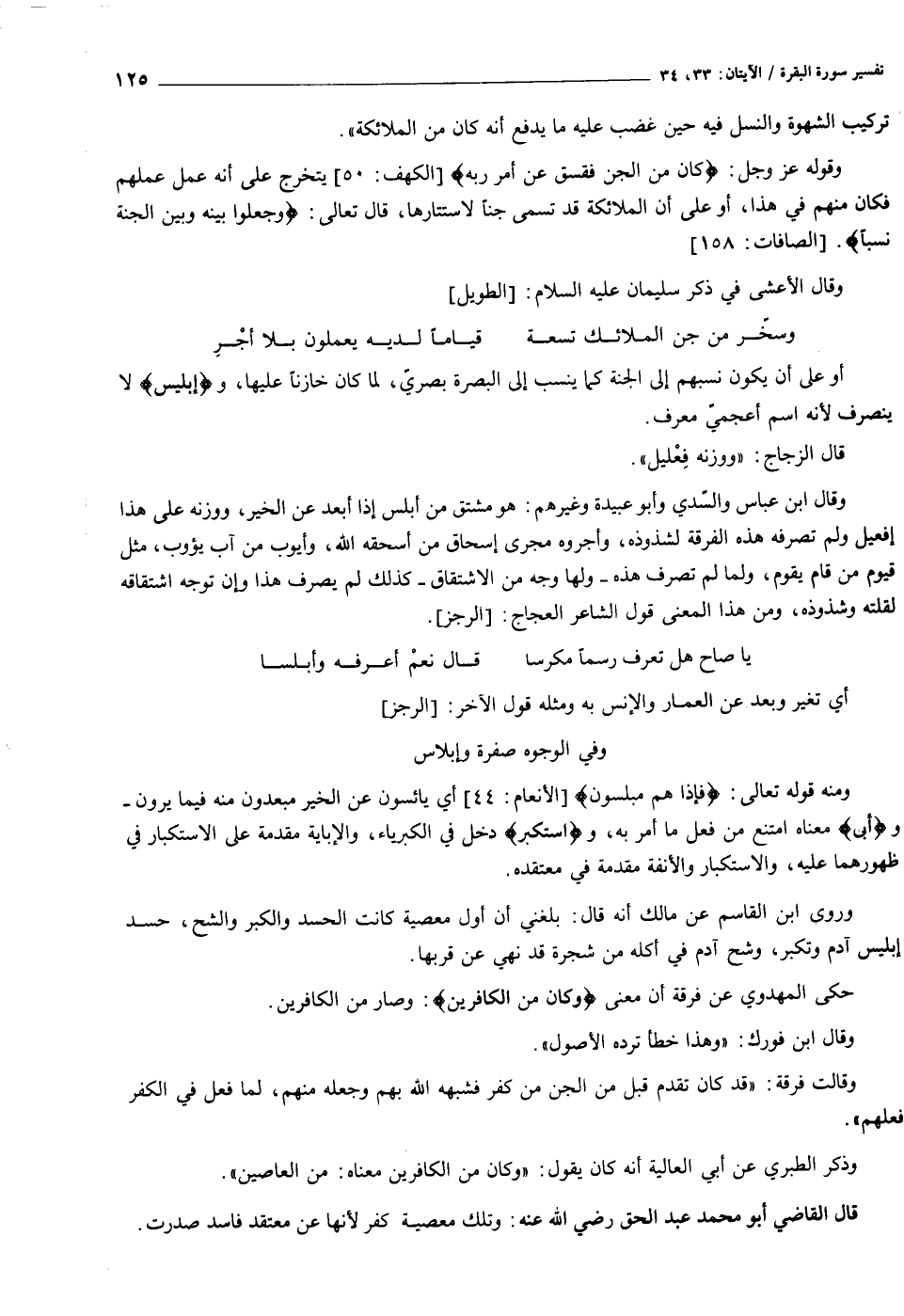وقال ابن عباس والسّدي وأبو عبيدة وغيرهم: هو مشتق من أبلس إذا أبعد عن الخير، ووزنه على هذا إفعيل ولم تصرفه هذه الفرقة لشذوذه، وأجروه مجرى إسحاق من أسحقه الله، وأيوب من آب يؤوب، مثل قيوم من قام يقوم، ولما لم تصرف هذه- ولها وجه من الاشتقاق- كذلك لم يصرف هذا وإن توجه اشتقاقه لقلته وشذوذه، ومن هذا المعنى قول الشاعر العجاج: [الرجز] .
