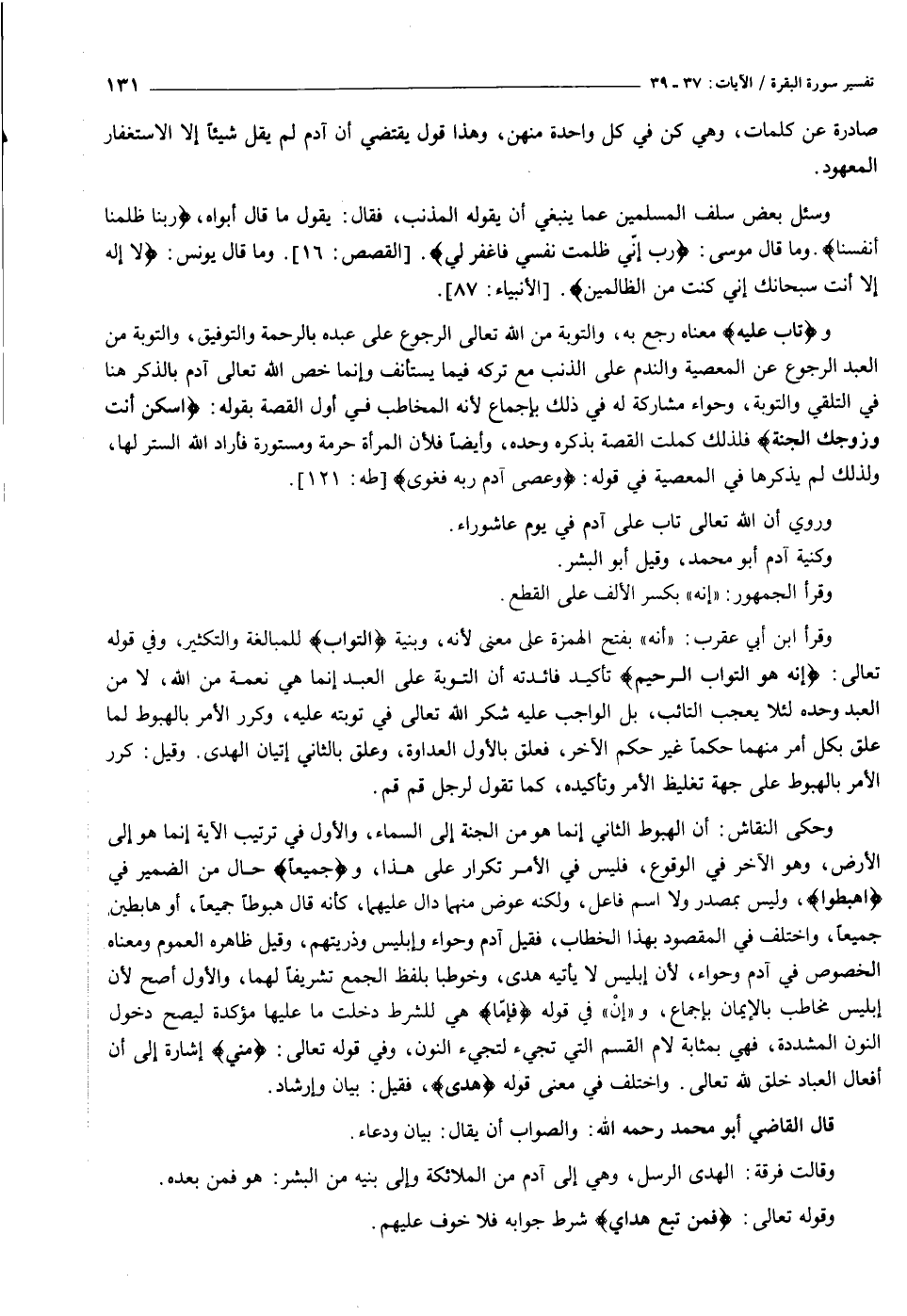 وقرأ ابن أبي عقرب: «أنه» بفتح الهمزة على معنى لأنه، وبنية التَّوَّابُ للمبالغة والتكثير، وفي قوله تعالى: إِنَّهُ هُوَ التَّوَّابُ الرَّحِيمُ تأكيد فائدته أن التوبة على العبد إنما هي نعمة من الله، لا من العبد وحده لئلا يعجب التائب، بل الواجب عليه شكر الله تعالى في توبته عليه، وكرر الأمر بالهبوط لما علق بكل أمر منهما حكما غير حكم الآخر، فعلق بالأول العداوة، وعلق بالثاني إتيان الهدى. وقيل: كرر الأمر بالهبوط على جهة تغليظ الأمر وتأكيده، كما تقول لرجل قم قم.