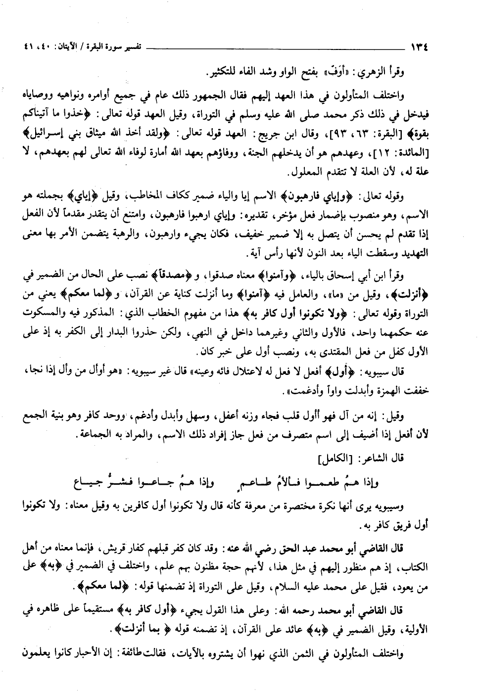 واختلف المتأولون في هذا العهد إليهم فقال الجمهور ذلك عام في جميع أوامره ونواهيه ووصاياه فيدخل في ذلك ذكر محمد صلى الله عليه وسلم في التوراة، وقيل العهد قوله تعالى: خُذُوا ما آتَيْناكُمْ بِقُوَّةٍ [البقرة: ٦٣، ٩٣] ، وقال ابن جريج: العهد قوله تعالى: وَلَقَدْ أَخَذَ اللَّهُ مِيثاقَ بَنِي إِسْرائِيلَ [المائدة: ١٢] ، وعهدهم هو أن يدخلهم الجنة، ووفاؤهم بعهد الله أمارة لوفاء الله تعالى لهم بعهدهم، لا علة له، لأن العلة لا تتقدم المعلول.