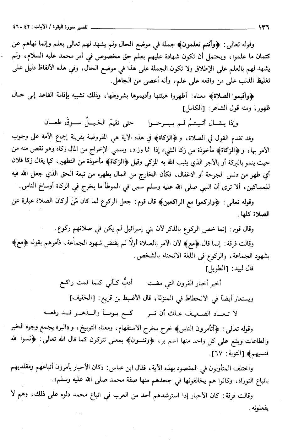 وَأَقِيمُوا الصَّلاةَ معناه: أظهروا هيئتها وأديموها بشروطها، وذلك تشبيه بإقامة القاعد إلى حال ظهور، ومنه قول الشاعر: [الكامل]