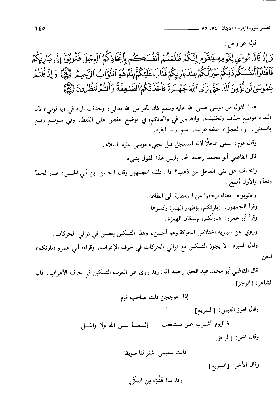 وَإِذْ قالَ مُوسى لِقَوْمِهِ يا قَوْمِ إِنَّكُمْ ظَلَمْتُمْ أَنْفُسَكُمْ بِاتِّخاذِكُمُ الْعِجْلَ فَتُوبُوا إِلى بارِئِكُمْ فَاقْتُلُوا أَنْفُسَكُمْ ذلِكُمْ خَيْرٌ لَكُمْ عِنْدَ بارِئِكُمْ فَتابَ عَلَيْكُمْ إِنَّهُ هُوَ التَّوَّابُ الرَّحِيمُ (٥٤) وَإِذْ قُلْتُمْ يا مُوسى لَنْ نُؤْمِنَ لَكَ حَتَّى نَرَى اللَّهَ جَهْرَةً فَأَخَذَتْكُمُ الصَّاعِقَةُ وَأَنْتُمْ تَنْظُرُونَ (٥٥)