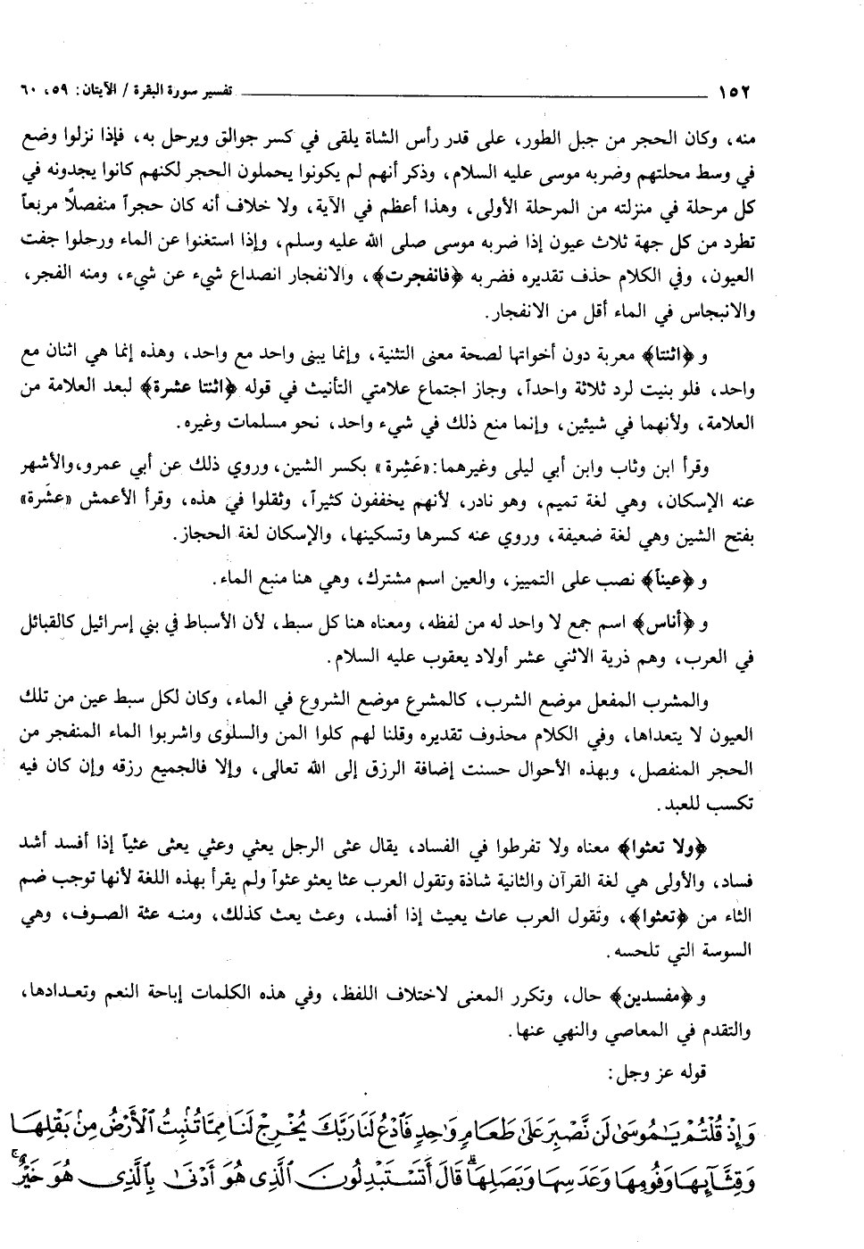 منه، وكان الحجر من جبل الطور، على قدر رأس الشاة يلقى في كسر جوالق ويرحل به، فإذا نزلوا وضع في وسط محلتهم وضربه موسى عليه السلام، وذكر أنهم لم يكونوا يحملون الحجر لكنهم كانوا يجدونه في كل مرحلة في منزلته من المرحلة الأولى، وهذا أعظم في الآية، ولا خلاف أنه كان حجرا منفصلا مربعا تطرد من كل جهة ثلاث عيون إذا ضربه موسى صلى الله عليه وسلم، وإذا استغنوا عن الماء ورحلوا جفت العيون، وفي الكلام حذف تقديره فضربه فَانْفَجَرَتْ، والانفجار انصداع شيء عن شيء، ومنه الفجر، والانبجاس في الماء أقل من الانفجار.