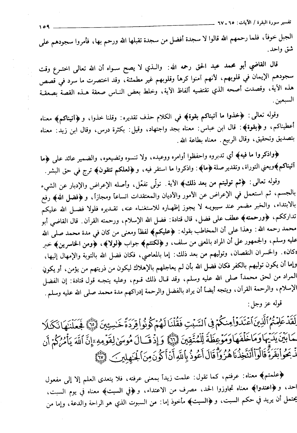 وَلَقَدْ عَلِمْتُمُ الَّذِينَ اعْتَدَوْا مِنْكُمْ فِي السَّبْتِ فَقُلْنا لَهُمْ كُونُوا قِرَدَةً خاسِئِينَ (٦٥) فَجَعَلْناها نَكالاً لِما بَيْنَ يَدَيْها وَما خَلْفَها وَمَوْعِظَةً لِلْمُتَّقِينَ (٦٦) وَإِذْ قالَ مُوسى لِقَوْمِهِ إِنَّ اللَّهَ يَأْمُرُكُمْ أَنْ تَذْبَحُوا بَقَرَةً قالُوا أَتَتَّخِذُنا هُزُواً قالَ أَعُوذُ بِاللَّهِ أَنْ أَكُونَ مِنَ الْجاهِلِينَ (٦٧)