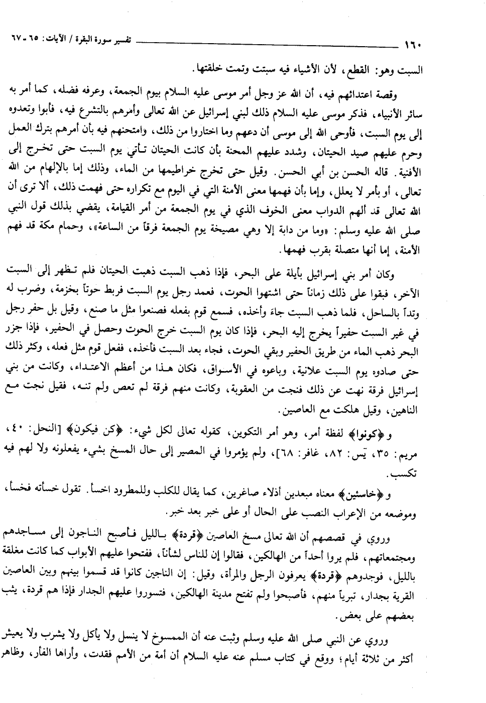 وكان أمر بني إسرائيل بأيلة على البحر، فإذا ذهب السبت ذهبت الحيتان فلم تظهر إلى السبت الآخر، فبقوا على ذلك زمانا حتى اشتهوا الحوت، فعمد رجل يوم السبت فربط حوتا بخزمة، وضرب له وتدا بالساحل، فلما ذهب السبت جاء وأخذه، فسمع قوم بفعله فصنعوا مثل ما صنع، وقيل بل حفر رجل في غير السبت حفيرا يخرج إليه البحر، فإذا كان يوم السبت خرج الحوت وحصل في الحفير، فإذا جزر البحر ذهب الماء من طريق الحفير وبقي الحوت، فجاء بعد السبت فأخذه، ففعل قوم مثل فعله، وكثر ذلك حتى صادوه يوم السبت علانية، وباعوه في الأسواق، فكان هذا من أعظم الاعتداء، وكانت من بني إسرائيل فرقة نهت عن ذلك فنجت من العقوبة، وكانت منهم فرقة لم تعص ولم تنه، فقيل نجت مع الناهين، وقيل هلكت مع العاصين.