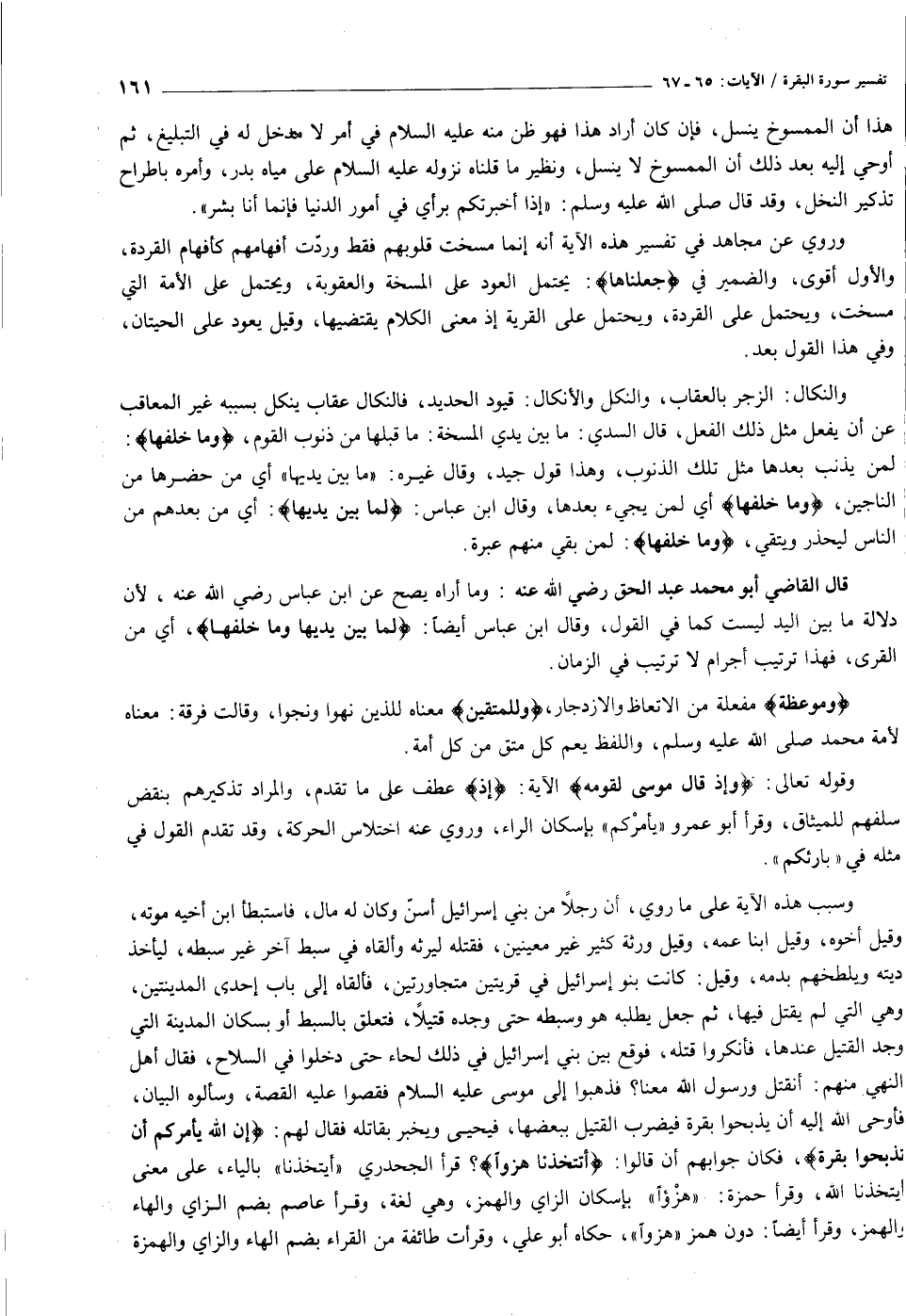 وسبب هذه الآية على ما روي، أن رجلا من بني إسرائيل أسنّ وكان له مال، فاستبطأ ابن أخيه موته، وقيل أخوه، وقيل ابنا عمه، وقيل ورثة كثير غير معينين، فقتله ليرثه وألقاه في سبط آخر غير سبطه، ليأخذ ديته ويلطخهم بدمه، وقيل: كانت بنو إسرائيل في قريتين متجاورتين، فألقاه إلى باب إحدى المدينتين، وهي التي لم يقتل فيها، ثم جعل يطلبه هو وسبطه حتى وجده قتيلا، فتعلق بالسبط أو بسكان المدينة التي وجد القتيل عندها، فأنكروا قتله، فوقع بين بني إسرائيل في ذلك لحاء حتى دخلوا في السلاح، فقال أهل النهي منهم: أنقتل ورسول الله معنا؟ فذهبوا إلى موسى عليه السلام فقصوا عليه القصة، وسألوه البيان، فأوحى الله إليه أن يذبحوا بقرة فيضرب القتيل ببعضها، فيحيى ويخبر بقاتله فقال لهم: إِنَّ اللَّهَ يَأْمُرُكُمْ أَنْ تَذْبَحُوا بَقَرَةً، فكان جوابهم أن قالوا: أَتَتَّخِذُنا هُزُواً قرأ الجحدري «أيتخذنا» بالياء، على معنى أيتخذنا الله، وقرأ حمزة: «هزؤا» بإسكان الزاي والهمز، وهي لغة، وقرأ عاصم بضم الزاي والهاء والهمز، وقرأ أيضا: دون همز «هزوا» ، حكاه أبو علي، وقرأت طائفة من القراء بضم الهاء والزاي والهمزة