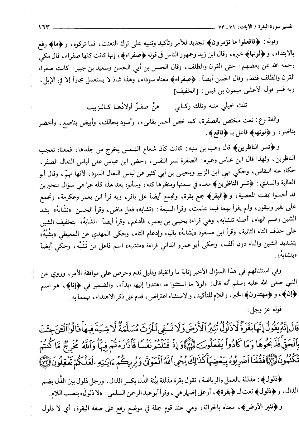 وتَسُرُّ النَّاظِرِينَ قال وهب بن منبه: كانت كأن شعاع الشمس يخرج من جلدها، فمعناه تعجب الناظرين، ولهذا قال ابن عباس وغيره: الصفرة تسر النفس، وحض ابن عباس على لباس النعال الصفر، حكاه عنه النقاش، وحكي نهي ابن الزبير ويحيى بن أبي كثير عن لباس النعال السود، لأنها تهمّ، وقال أبو العالية والسدي: تَسُرُّ النَّاظِرِينَ معناه في سمنها ومنظرها كله، وسألوه بعد هذا كله عما هي سؤال متحيرين قد أحسوا بمقت المعصية، والْبَقَرَ جمع بقرة، وتجمع أيضا على باقر، وبه قرأ ابن يعمر وعكرمة، وتجمع على بقير وبيقور، ولم يقرأ بهما فيما علمت، وقرأ السبعة: «تشابه» فعل ماض، وقرأ الحسن «تشّابه» بشد الشين وضم الهاء، أصله تتشابه، وهي قراءة يحيى بن يعمر، فأدغم، وقرأ أيضا «تشابه» بتخفيف الشين على حذف التاء الثانية، وقرأ ابن مسعود «يشابه» بالياء وإدغام التاء، وحكى المهدي عن المعيطي «يشّبّه» بتشديد الشين والباء دون ألف، وحكى أبو عمرو الداني قراءة «متشبه» اسم فاعل من تشبّه، وحكي أيضا «يتشابه» .