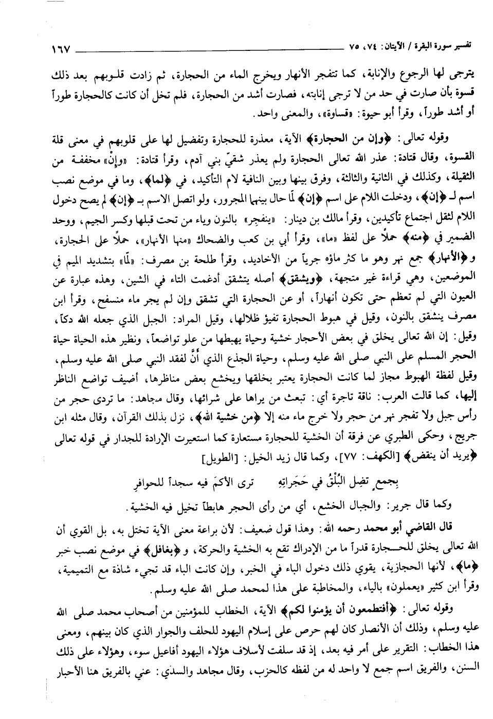 وقوله تعالى: وَإِنَّ مِنَ الْحِجارَةِ الآية، معذرة للحجارة وتفضيل لها على قلوبهم في معنى قلة القسوة، وقال قتادة: عذر الله تعالى الحجارة ولم يعذر شقيّ بني آدم، وقرأ قتادة: «وإن» مخففة من الثقيلة، وكذلك في الثانية والثالثة، وفرق بينها وبين النافية لام التأكيد، في لَما، وما في موضع نصب اسم ل إِنَّ، ودخلت اللام على اسم إِنَّ لمّا حال بينهما المجرور، ولو اتصل الاسم ب إِنَّ لم يصح دخول اللام لثقل اجتماع تأكيدين، وقرأ مالك بن دينار: «ينفجر» بالنون وياء من تحت قبلها وكسر الجيم، ووحد الضمير في مِنْهُ حملا على لفظ «ما» ، وقرأ أبي بن كعب والضحاك «منها الأنهار» ، حملا على الحجارة، والْأَنْهارُ جمع نهر وهو ما كثر ماؤه جريا من الأخاديد، وقرأ طلحة بن مصرف: «لمّا» بتشديد الميم في الموضعين، وهي قراءة غير متجهة، ويَشَّقَّقُ أصله يتشقق أدغمت التاء في الشين، وهذه عبارة عن العيون التي لم تعظم حتى تكون أنهارا، أو عن الحجارة التي تشقق وإن لم يجر ماء منسفح، وقرأ ابن مصرف ينشقق بالنون، وقيل في هبوط الحجارة تفيؤ ظلالها، وقيل المراد: الجبل الذي جعله الله دكا، وقيل: إن الله تعالى يخلق في بعض الأحجار خشية وحياة يهبطها من علو تواضعا، ونظير هذه الحياة حياة الحجر المسلم على النبي صلى الله عليه وسلم، وحياة الجذع الذي أنّ لفقد النبي صلى الله عليه وسلم، وقيل لفظة الهبوط مجاز لما كانت الحجارة يعتبر بخلقها ويخشع بعض مناظرها، أضيف تواضع الناظر إليها، كما قالت العرب: ناقة تاجرة أي: تبعث من يراها على شرائها، وقال مجاهد: ما تردى حجر من رأس جبل ولا تفجر نهر من حجر ولا خرج ماء منه إلا مِنْ خَشْيَةِ اللَّهِ، نزل بذلك القرآن، وقال مثله ابن جريج، وحكى الطبري عن فرقة أن الخشية للحجارة مستعارة كما استعيرت الإرادة للجدار في قوله تعالى يُرِيدُ أَنْ يَنْقَضَّ [الكهف: ٧٧] ، وكما قال زيد الخيل: [الطويل]