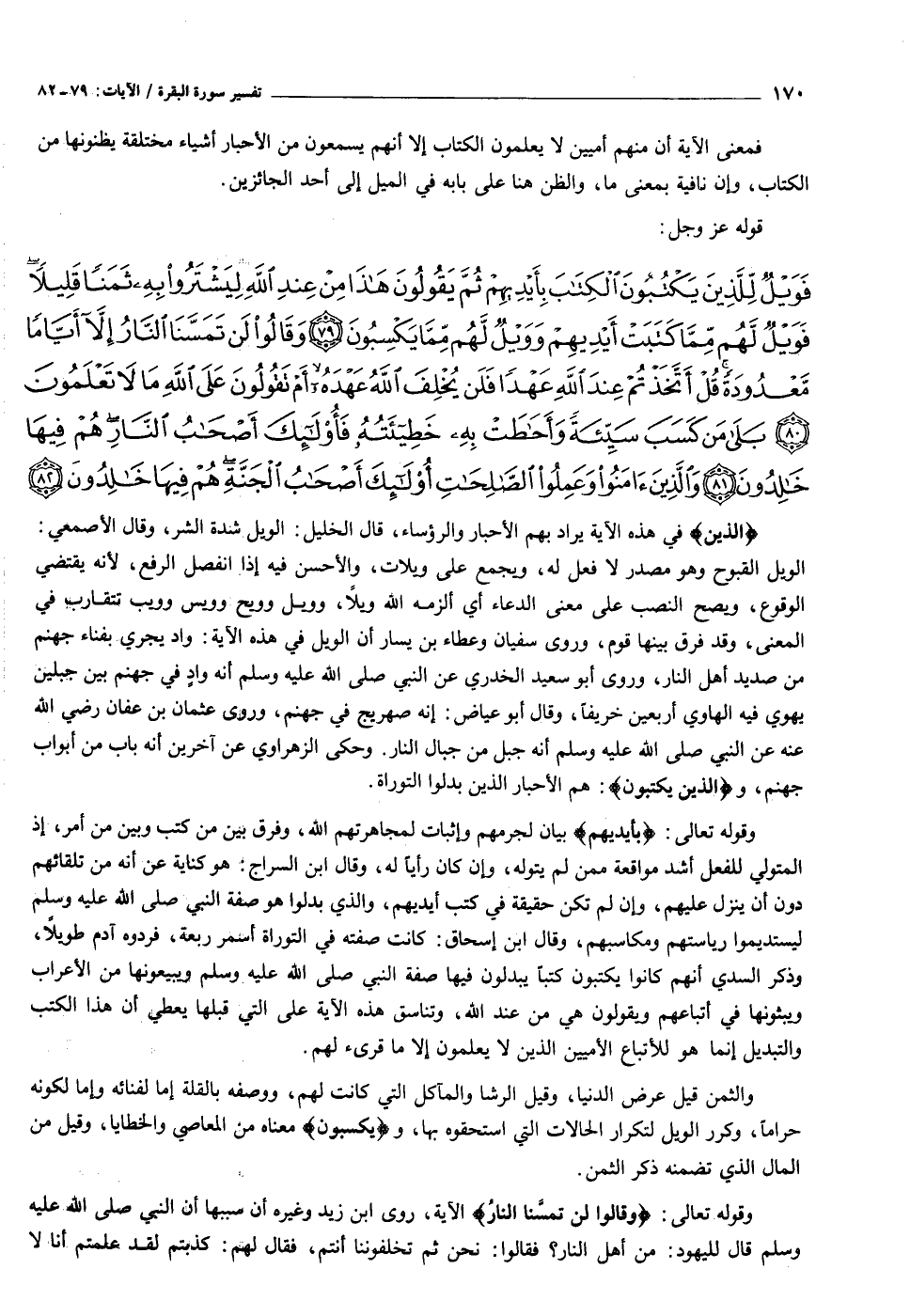 فَوَيْلٌ لِلَّذِينَ يَكْتُبُونَ الْكِتابَ بِأَيْدِيهِمْ ثُمَّ يَقُولُونَ هذا مِنْ عِنْدِ اللَّهِ لِيَشْتَرُوا بِهِ ثَمَناً قَلِيلاً فَوَيْلٌ لَهُمْ مِمَّا كَتَبَتْ أَيْدِيهِمْ وَوَيْلٌ لَهُمْ مِمَّا يَكْسِبُونَ (٧٩) وَقالُوا لَنْ تَمَسَّنَا النَّارُ إِلاَّ أَيَّاماً مَعْدُودَةً قُلْ أَتَّخَذْتُمْ عِنْدَ اللَّهِ عَهْداً فَلَنْ يُخْلِفَ اللَّهُ عَهْدَهُ أَمْ تَقُولُونَ عَلَى اللَّهِ ما لا تَعْلَمُونَ (٨٠) بَلى مَنْ كَسَبَ سَيِّئَةً وَأَحاطَتْ بِهِ خَطِيئَتُهُ فَأُولئِكَ أَصْحابُ النَّارِ هُمْ فِيها خالِدُونَ (٨١) وَالَّذِينَ آمَنُوا وَعَمِلُوا الصَّالِحاتِ أُولئِكَ أَصْحابُ الْجَنَّةِ هُمْ فِيها خالِدُونَ (٨٢)