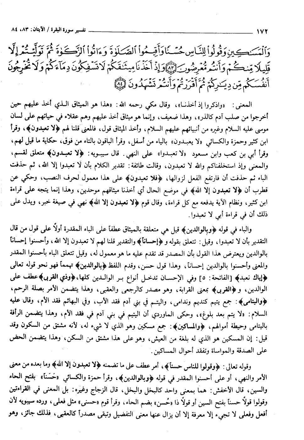 وَإِذْ أَخَذْنا مِيثاقَ بَنِي إِسْرائِيلَ لا تَعْبُدُونَ إِلاَّ اللَّهَ وَبِالْوالِدَيْنِ إِحْساناً وَذِي الْقُرْبى وَالْيَتامى وَالْمَساكِينِ وَقُولُوا لِلنَّاسِ حُسْناً وَأَقِيمُوا الصَّلاةَ وَآتُوا الزَّكاةَ ثُمَّ تَوَلَّيْتُمْ إِلاَّ قَلِيلاً مِنْكُمْ وَأَنْتُمْ مُعْرِضُونَ (٨٣) وَإِذْ أَخَذْنا مِيثاقَكُمْ لا تَسْفِكُونَ دِماءَكُمْ وَلا تُخْرِجُونَ أَنْفُسَكُمْ مِنْ دِيارِكُمْ ثُمَّ أَقْرَرْتُمْ وَأَنْتُمْ تَشْهَدُونَ (٨٤)