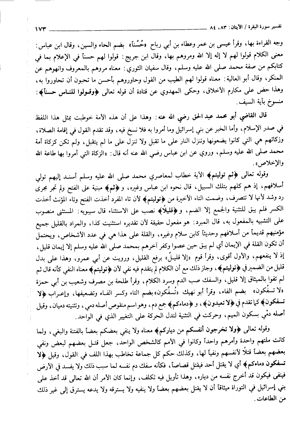 وقوله تعالى ثُمَّ تَوَلَّيْتُمْ الآية خطاب لمعاصري محمد صلى الله عليه وسلم أسند إليهم تولي أسلافهم، إذ هم كلهم بتلك السبيل، قال نحوه ابن عباس وغيره، وثُمَّ مبنية على الفتح ولم تجر مجرى رد وشد لأنها لا تتصرف، وضمت التاء الأخيرة من تَوَلَّيْتُمْ لأن تاء المفرد أخذت الفتح وتاء المؤنث أخذت الكسر فلم يبق للتثنية والجمع إلا الضم، وقَلِيلًا نصب على الاستثناء قال سيبويه: المستثنى منصوب على التشبيه بالمفعول به، قال المبرد: هو مفعول حقيقة لأن تقديره استثنيت كذا، والمراد بالقليل جميع مؤمنيهم قديما من أسلافهم وحديثا كابن سلام وغيره، والقلة على هذه هي في عدد الأشخاص، ويحتمل أن تكون القلة في الإيمان أي لم يبق حين عصوا وكفر آخرهم بمحمد صلى الله عليه وسلم إلا إيمان قليل، إذ لا ينفعهم، والأول أقوى، وقرأ قوم «إلا قليل» برفع القليل، ورويت عن أبي عمرو، وهذا على بدل قليل من الضمير في تَوَلَّيْتُمْ، وجاز ذلك مع أن الكلام لم يتقدم فيه نفي لأن تَوَلَّيْتُمْ معناه النفي كأنه قال ثم لم تفوا بالميثاق إلا قليل، والسفك صب الدم وسرد الكلام، وقرأ طلحة بن مصرف وشعيب بن أبي حمزة «لا تسفكون» بضم الفاء، وقرأ أبو نهيك «تسفّكون» بضم التاء وكسر الفاء وتضعيفها، وإعراب لا تَسْفِكُونَ كما تقدم في لا تَعْبُدُونَ، ودِماءَكُمْ جمع دم، وهو اسم منقوص أصله دمي، وتثنيته دميان، وقيل أصله دمي بسكون الميم، وحركت في التثنية لتدل الحركة على التغيير الذي في الواحد.