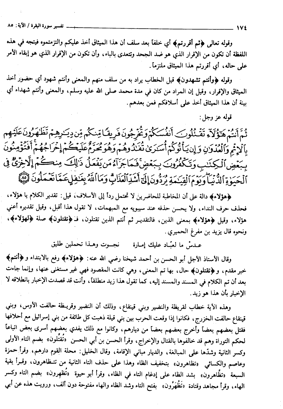 وهذه الآية خطاب لقريظة والنضير وبني قينقاع، وذلك أن النضير وقريظة حالفت الأوس، وبني قينقاع حالفت الخزرج، فكانوا إذا وقعت الحرب بين بني قيلة ذهبت كل طائفة من بني إسرائيل مع أحلافها فقتل بعضهم بعضا وأخرج بعضهم بعضا من ديارهم، وكانوا مع ذلك يفدي بعضهم أسرى بعض اتباعا لحكم التوراة وهم قد خالفوها بالقتال والإخراج، وقرأ الحسن بن أبي الحسن «تقتّلون» بضم التاء الأولى وكسر الثانية وشدّها على المبالغة، والديار مباني الإقامة، وقال الخليل: محلة القوم دارهم، وقرأ حمزة وعاصم والكسائي «تظاهرون» بتخفيف الظاء وهذا على حذف التاء الثانية من تتظاهرون، وقرأ بقية السبعة «تظّاهرون» بشد الظاء على إدغام التاء في الظاء، وقرأ أبو حيوة «تظهرون» بضم التاء وكسر الهاء، وقرأ مجاهد وقتادة «تظّهرّون» بفتح التاء وشد الظاء والهاء مفتوحة دون ألف، ورويت هذه عن أبي