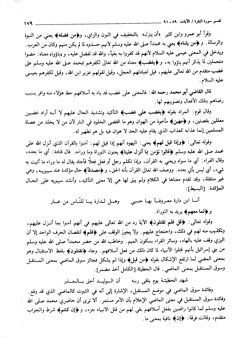 وقوله تعالى: قُلْ فَلِمَ تَقْتُلُونَ الآية رد من الله تعالى عليهم في أنهم آمنوا بما أنزل عليهم، وتكذيب منه لهم في ذلك، واحتجاج عليهم. ولا يجوز الوقف على فَلِمَ لنقصان الحرف الواحد إلا أن البزي وقف عليه بالهاء، وسائر القراء بسكون الميم. وخاطب الله من حضر محمدا صلى الله عليه وسلم من بني إسرائيل بأنهم قتلوا الأنبياء لما كان ذلك من فعل أسلافهم. وجاء تَقْتُلُونَ بلفظ الاستقبال وهو بمعنى المضي لما ارتفع الإشكال بقوله مِنْ قَبْلُ وإذا لم يشكل فجائز سوق الماضي بمعنى المستقبل وسوق المستقبل بمعنى الماضي. قال الحطيئة [الكامل أخذ مضمر] .