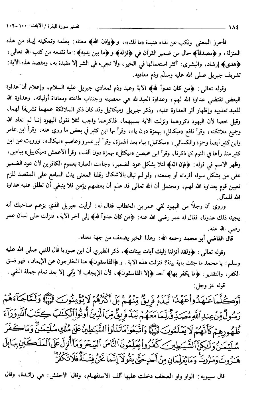 أَوَكُلَّما عاهَدُوا عَهْداً نَبَذَهُ فَرِيقٌ مِنْهُمْ بَلْ أَكْثَرُهُمْ لا يُؤْمِنُونَ (١٠٠) وَلَمَّا جاءَهُمْ رَسُولٌ مِنْ عِنْدِ اللَّهِ مُصَدِّقٌ لِما مَعَهُمْ نَبَذَ فَرِيقٌ مِنَ الَّذِينَ أُوتُوا الْكِتابَ كِتابَ اللَّهِ وَراءَ ظُهُورِهِمْ كَأَنَّهُمْ لا يَعْلَمُونَ (١٠١) وَاتَّبَعُوا ما تَتْلُوا الشَّياطِينُ عَلى مُلْكِ سُلَيْمانَ وَما كَفَرَ سُلَيْمانُ وَلكِنَّ الشَّياطِينَ كَفَرُوا يُعَلِّمُونَ النَّاسَ السِّحْرَ وَما أُنْزِلَ عَلَى الْمَلَكَيْنِ بِبابِلَ هارُوتَ وَمارُوتَ وَما يُعَلِّمانِ مِنْ أَحَدٍ حَتَّى يَقُولا إِنَّما نَحْنُ فِتْنَةٌ فَلا تَكْفُرْ فَيَتَعَلَّمُونَ مِنْهُما ما يُفَرِّقُونَ بِهِ بَيْنَ الْمَرْءِ وَزَوْجِهِ وَما هُمْ بِضارِّينَ بِهِ مِنْ أَحَدٍ إِلاَّ بِإِذْنِ اللَّهِ وَيَتَعَلَّمُونَ ما يَضُرُّهُمْ وَلا يَنْفَعُهُمْ وَلَقَدْ عَلِمُوا لَمَنِ اشْتَراهُ ما لَهُ فِي الْآخِرَةِ مِنْ خَلاقٍ وَلَبِئْسَ ما شَرَوْا بِهِ أَنْفُسَهُمْ لَوْ كانُوا يَعْلَمُونَ (١٠٢)