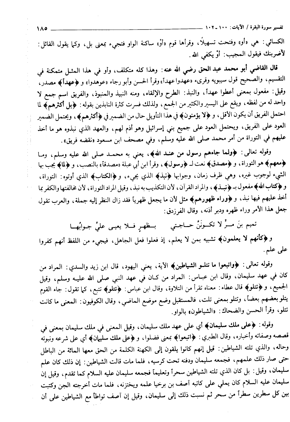 وقوله تعالى: وَاتَّبَعُوا ما تَتْلُوا الشَّياطِينُ الآية، يعني اليهود، قال ابن زيد والسدي: المراد من كان في عهد سليمان، وقال ابن عباس: المراد من كان في عهد النبي صلى الله عليه وسلم، وقيل الجميع، وتَتْلُوا قال عطاء: معناه تقرأ من التلاوة، وقال ابن عباس: تَتْلُوا تتبع، كما تقول: جاء القوم يتلو بعضهم بعضا، وتتلو بمعنى تلت، فالمستقبل وضع موضع الماضي، وقال الكوفيون: المعنى ما كانت تتلو، وقرأ الحسن والضحاك: «الشياطون» بالواو.