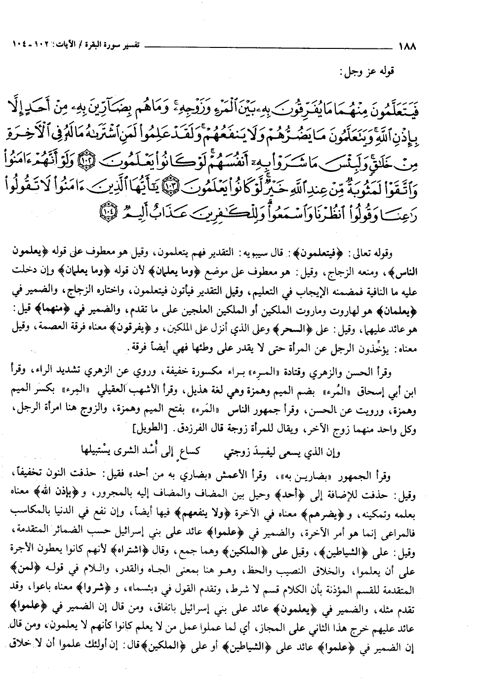 وقوله تعالى: فَيَتَعَلَّمُونَ: قال سيبويه: التقدير فهم يتعلمون، وقيل هو معطوف على قوله يُعَلِّمُونَ النَّاسَ، ومنعه الزجاج، وقيل: هو معطوف على موضع وَما يُعَلِّمانِ لأن قوله وَما يُعَلِّمانِ وإن دخلت عليه ما النافية فمضمنه الإيجاب في التعليم، وقيل التقدير فيأتون فيتعلمون، واختاره الزجاج، والضمير في يُعَلِّمانِ هو لهاروت وماروت الملكين أو الملكين العلجين على ما تقدم، والضمير في مِنْهُما قيل:
