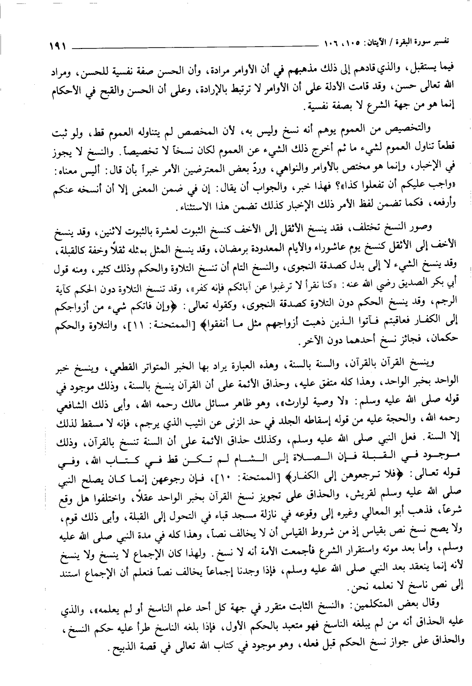 وصور النسخ تختلف، فقد ينسخ الأثقل إلى الأخف كنسخ الثبوت لعشرة بالثبوت لاثنين، وقد ينسخ الأخف إلى الأثقل كنسخ يوم عاشوراء والأيام المعدودة برمضان، وقد ينسخ المثل بمثله ثقلا وخفة كالقبلة، وقد ينسخ الشيء لا إلى بدل كصدقة النجوى، والنسخ التام أن تنسخ التلاوة والحكم وذلك كثير، ومنه قول أبي بكر الصديق رضي الله عنه: «كنا نقرأ لا ترغبوا عن آبائكم فإنه كفر» ، وقد تنسخ التلاوة دون الحكم كآية الرجم، وقد ينسخ الحكم دون التلاوة كصدقة النجوى، وكقوله تعالى: وَإِنْ فاتَكُمْ شَيْءٌ مِنْ أَزْواجِكُمْ إِلَى الْكُفَّارِ فَعاقَبْتُمْ فَآتُوا الَّذِينَ ذَهَبَتْ أَزْواجُهُمْ مِثْلَ ما أَنْفَقُوا [الممتحنة: ١١] ، والتلاوة والحكم حكمان، فجائز نسخ أحدهما دون الآخر.