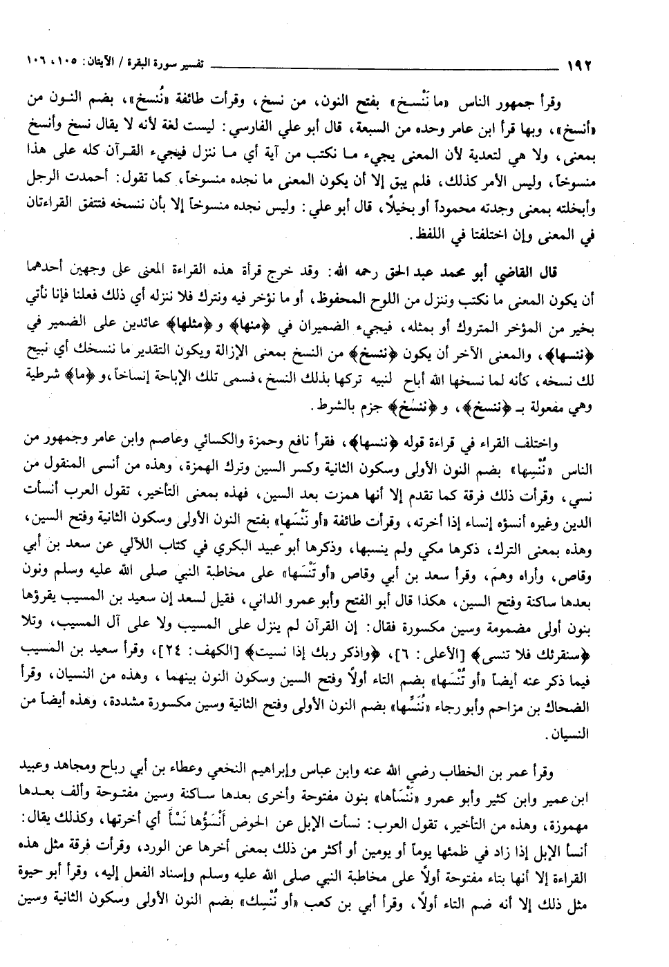 واختلف القراء في قراءة قوله نُنْسِها، فقرأ نافع وحمزة والكسائي وعاصم وابن عامر وجمهور من الناس «ننسها» بضم النون الأولى وسكون الثانية وكسر السين وترك الهمزة، وهذه من أنسى المنقول من نسي، وقرأت ذلك فرقة كما تقدم إلا أنها همزت بعد السين، فهذه بمعنى التأخير، تقول العرب أنسأت الدين وغيره أنسؤه إنساء إذا أخرته، وقرأت طائفة «أو ننسها» بفتح النون الأولى وسكون الثانية وفتح السين، وهذه بمعنى الترك، ذكرها مكي ولم ينسبها، وذكرها أبو عبيد البكري في كتاب اللآلي عن سعد بن أبي وقاص، وأراه وهم، وقرأ سعد بن أبي وقاص «أو تنسها» على مخاطبة النبي صلى الله عليه وسلم ونون بعدها ساكنة وفتح السين، هكذا قال أبو الفتح وأبو عمرو الداني، فقيل لسعد إن سعيد بن المسيب يقرؤها بنون أولى مضمومة وسين مكسورة فقال: إن القرآن لم ينزل على المسيب ولا على آل المسيب، وتلا سَنُقْرِئُكَ فَلا تَنْسى [الأعلى: ٦] ، وَاذْكُرْ رَبَّكَ إِذا نَسِيتَ [الكهف: ٢٤] ، وقرأ سعيد بن المسيب فيما ذكر عنه أيضا «أو تنسها» بضم التاء أولا وفتح السين وسكون النون بينهما، وهذه من النسيان، وقرأ الضحاك بن مزاحم وأبو رجاء «ننسّها» بضم النون الأولى وفتح الثانية وسين مكسورة مشددة، وهذه أيضا من النسيان.