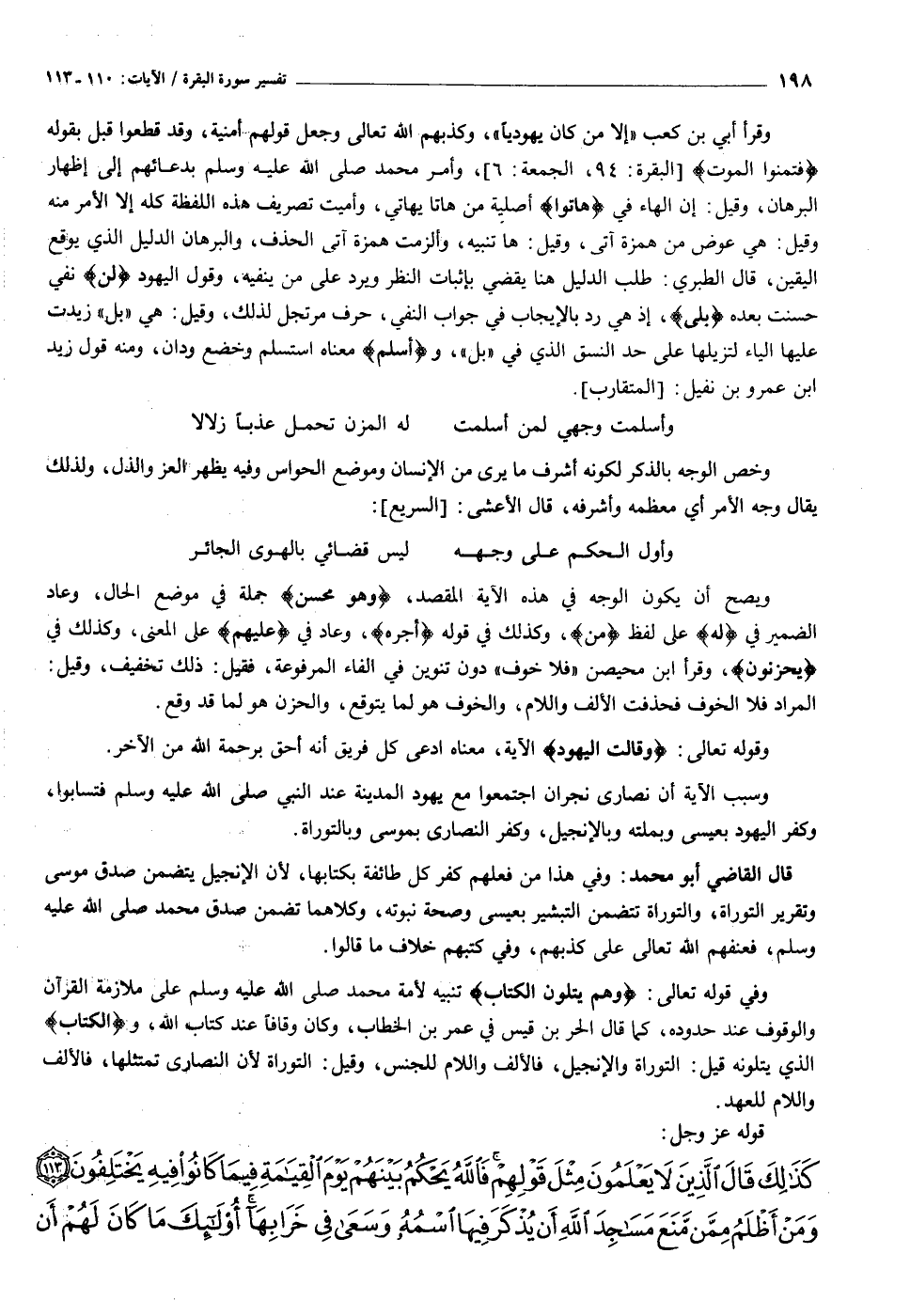 وفي قوله تعالى: وَهُمْ يَتْلُونَ الْكِتابَ تنبيه لأمة محمد صلى الله عليه وسلم على ملازمة القرآن والوقوف عند حدوده، كما قال الحر بن قيس في عمر بن الخطاب، وكان وقافا عند كتاب الله، والْكِتابَ الذي يتلونه قيل: التوراة والإنجيل، فالألف واللام للجنس، وقيل: التوراة لأن النصارى تمتثلها، فالألف واللام للعهد.