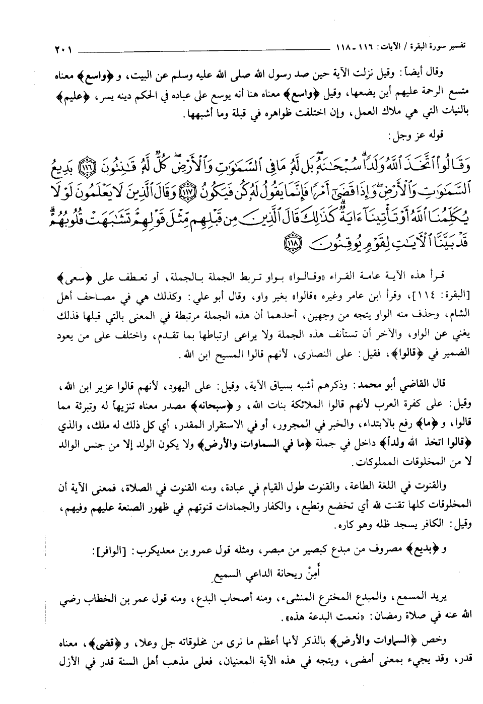 وَقالُوا اتَّخَذَ اللَّهُ وَلَداً سُبْحانَهُ بَلْ لَهُ ما فِي السَّماواتِ وَالْأَرْضِ كُلٌّ لَهُ قانِتُونَ (١١٦) بَدِيعُ السَّماواتِ وَالْأَرْضِ وَإِذا قَضى أَمْراً فَإِنَّما يَقُولُ لَهُ كُنْ فَيَكُونُ (١١٧) وَقالَ الَّذِينَ لا يَعْلَمُونَ لَوْلا يُكَلِّمُنَا اللَّهُ أَوْ تَأْتِينا آيَةٌ كَذلِكَ قالَ الَّذِينَ مِنْ قَبْلِهِمْ مِثْلَ قَوْلِهِمْ تَشابَهَتْ قُلُوبُهُمْ قَدْ بَيَّنَّا الْآياتِ لِقَوْمٍ يُوقِنُونَ (١١٨)