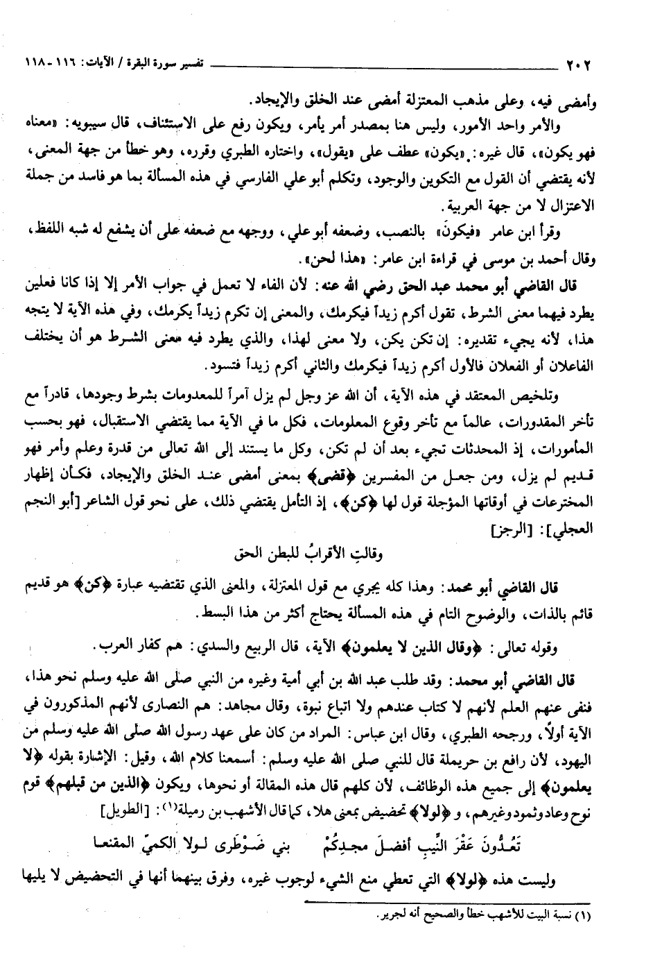 وتلخيص المعتقد في هذه الآية، أن الله عز وجل لم يزل آمرا للمعدومات بشرط وجودها، قادرا مع تأخر المقدورات، عالما مع تأخر وقوع المعلومات، فكل ما في الآية مما يقتضي الاستقبال، فهو بحسب المأمورات، إذ المحدثات تجيء بعد أن لم تكن، وكل ما يستند إلى الله تعالى من قدرة وعلم وأمر فهو قديم لم يزل، ومن جعل من المفسرين قَضى بمعنى أمضى عند الخلق والإيجاد، فكأن إظهار المخترعات في أوقاتها المؤجلة قول لها كُنْ، إذ التأمل يقتضي ذلك، على نحو قول الشاعر [أبو النجم العجلي] : [الرجز] وقالت الأقراب للبطن الحق قال القاضي أبو محمد: وهذا كله يجري مع قول المعتزلة، والمعنى الذي تقتضيه عبارة كُنْ هو قديم قائم بالذات، والوضوح التام في هذه المسألة يحتاج أكثر من هذا البسط.