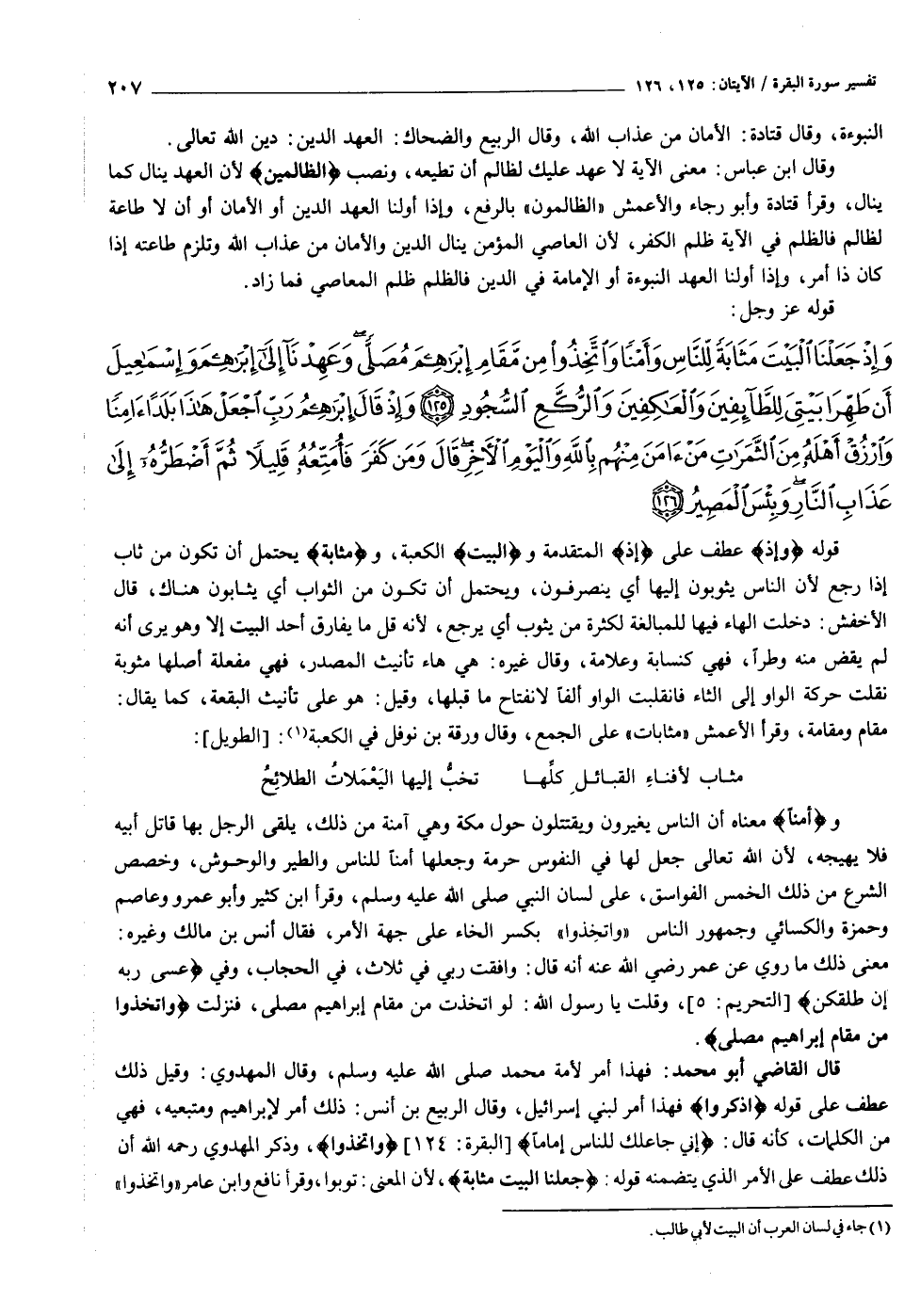 وَإِذْ جَعَلْنَا الْبَيْتَ مَثابَةً لِلنَّاسِ وَأَمْناً وَاتَّخِذُوا مِنْ مَقامِ إِبْراهِيمَ مُصَلًّى وَعَهِدْنا إِلى إِبْراهِيمَ وَإِسْماعِيلَ أَنْ طَهِّرا بَيْتِيَ لِلطَّائِفِينَ وَالْعاكِفِينَ وَالرُّكَّعِ السُّجُودِ (١٢٥) وَإِذْ قالَ إِبْراهِيمُ رَبِّ اجْعَلْ هذا بَلَداً آمِناً وَارْزُقْ أَهْلَهُ مِنَ الثَّمَراتِ مَنْ آمَنَ مِنْهُمْ بِاللَّهِ وَالْيَوْمِ الْآخِرِ قالَ وَمَنْ كَفَرَ فَأُمَتِّعُهُ قَلِيلاً ثُمَّ أَضْطَرُّهُ إِلى عَذابِ النَّارِ وَبِئْسَ الْمَصِيرُ (١٢٦)