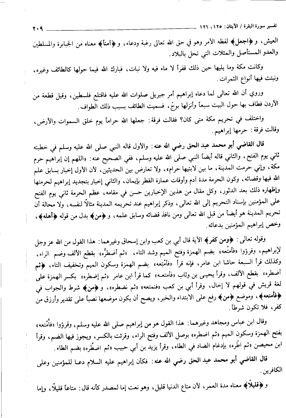 وقوله تعالى: وَمَنْ كَفَرَ الآية قال أبي بن كعب وابن إسحاق وغيرهما: هذا القول من الله عز وجل لإبراهيم، وقرؤوا «فأمتّعه» بضم الهمزة وفتح الميم وشد التاء، «ثم اضطرّه» بقطع الألف وضم الراء، وكذلك قرأ السبعة حاشا ابن عامر، فإنه قرأ «فأمتعه» بضم الهمزة وسكون الميم وتخفيف التاء، «ثُمَّ أَضْطَرُّهُ» بقطع الألف، وقرأ يحيى بن وثاب «فأمتعه» كما قرأ ابن عامر «ثم اضطره» بكسر الهمزة على لغة قريش في قولهم لا إخال، وقرأ أبي بن كعب «فنمتعه» «ثم نضطره» ، ومِنَ شرط والجواب في فَأُمَتِّعُهُ، وموضع مِنَ رفع على الابتداء والخبر، ويصح أن يكون موضعها نصبا على تقدير وأرزق من كفر، فلا تكون شرطا.