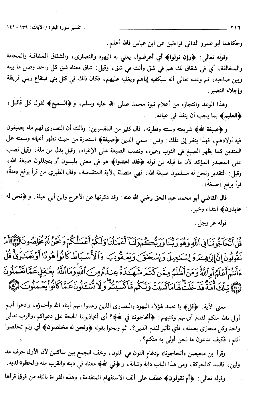 قُلْ أَتُحَاجُّونَنا فِي اللَّهِ وَهُوَ رَبُّنا وَرَبُّكُمْ وَلَنا أَعْمالُنا وَلَكُمْ أَعْمالُكُمْ وَنَحْنُ لَهُ مُخْلِصُونَ (١٣٩) أَمْ تَقُولُونَ إِنَّ إِبْراهِيمَ وَإِسْماعِيلَ وَإِسْحاقَ وَيَعْقُوبَ وَالْأَسْباطَ كانُوا هُوداً أَوْ نَصارى قُلْ أَأَنْتُمْ أَعْلَمُ أَمِ اللَّهُ وَمَنْ أَظْلَمُ مِمَّنْ كَتَمَ شَهادَةً عِنْدَهُ مِنَ اللَّهِ وَمَا اللَّهُ بِغافِلٍ عَمَّا تَعْمَلُونَ (١٤٠) تِلْكَ أُمَّةٌ قَدْ خَلَتْ لَها ما كَسَبَتْ وَلَكُمْ ما كَسَبْتُمْ وَلا تُسْئَلُونَ عَمَّا كانُوا يَعْمَلُونَ (١٤١)