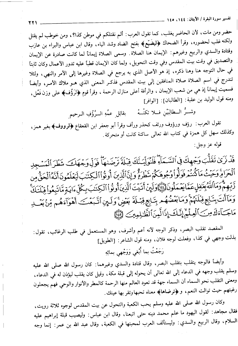 قَدْ نَرى تَقَلُّبَ وَجْهِكَ فِي السَّماءِ فَلَنُوَلِّيَنَّكَ قِبْلَةً تَرْضاها فَوَلِّ وَجْهَكَ شَطْرَ الْمَسْجِدِ الْحَرامِ وَحَيْثُ ما كُنْتُمْ فَوَلُّوا وُجُوهَكُمْ شَطْرَهُ وَإِنَّ الَّذِينَ أُوتُوا الْكِتابَ لَيَعْلَمُونَ أَنَّهُ الْحَقُّ مِنْ رَبِّهِمْ وَمَا اللَّهُ بِغافِلٍ عَمَّا يَعْمَلُونَ (١٤٤) وَلَئِنْ أَتَيْتَ الَّذِينَ أُوتُوا الْكِتابَ بِكُلِّ آيَةٍ ما تَبِعُوا قِبْلَتَكَ وَما أَنْتَ بِتابِعٍ قِبْلَتَهُمْ وَما بَعْضُهُمْ بِتابِعٍ قِبْلَةَ بَعْضٍ وَلَئِنِ اتَّبَعْتَ أَهْواءَهُمْ مِنْ بَعْدِ ما جاءَكَ مِنَ الْعِلْمِ إِنَّكَ إِذاً لَمِنَ الظَّالِمِينَ (١٤٥)