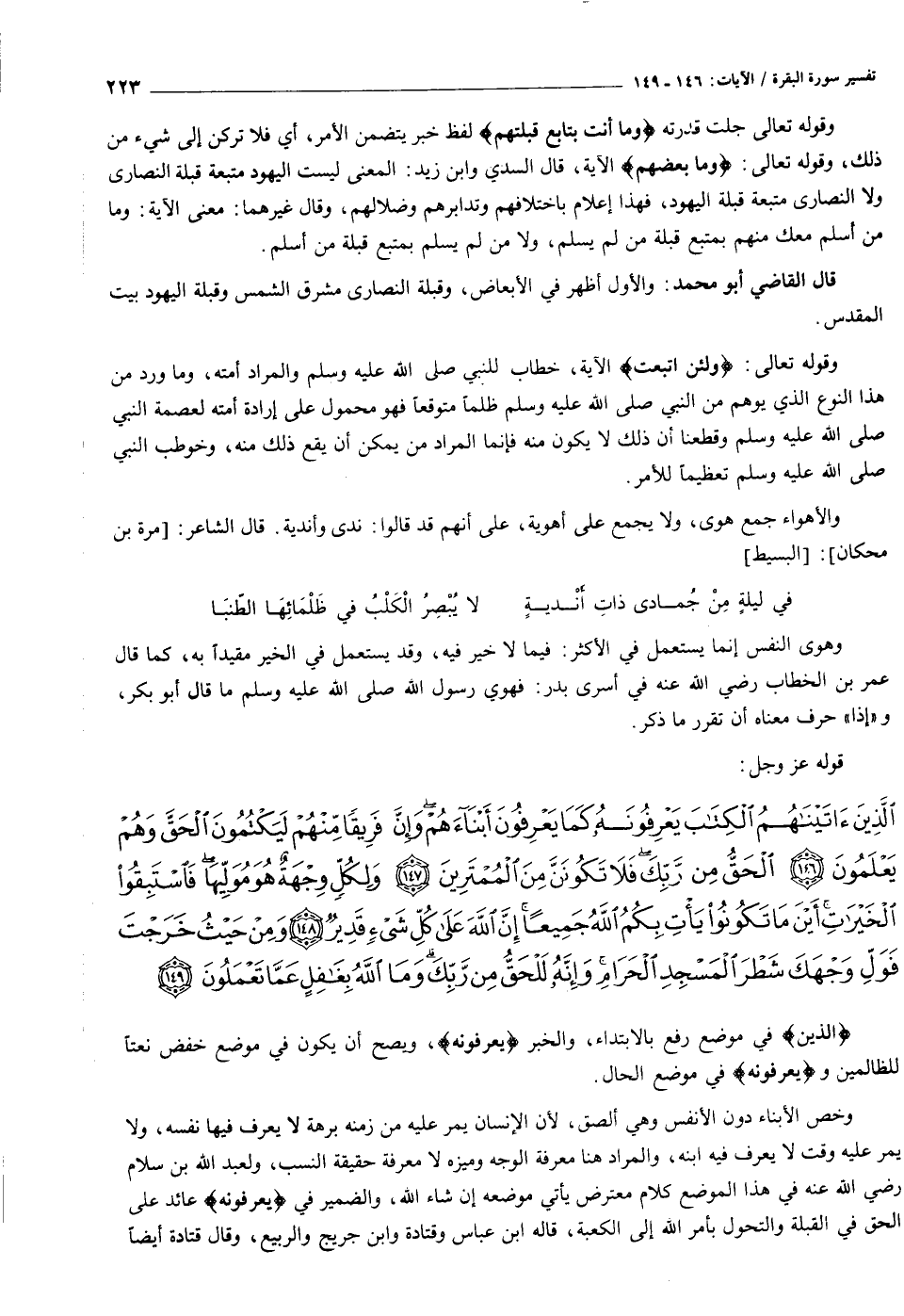 الَّذِينَ آتَيْناهُمُ الْكِتابَ يَعْرِفُونَهُ كَما يَعْرِفُونَ أَبْناءَهُمْ وَإِنَّ فَرِيقاً مِنْهُمْ لَيَكْتُمُونَ الْحَقَّ وَهُمْ يَعْلَمُونَ (١٤٦) الْحَقُّ مِنْ رَبِّكَ فَلا تَكُونَنَّ مِنَ الْمُمْتَرِينَ (١٤٧) وَلِكُلٍّ وِجْهَةٌ هُوَ مُوَلِّيها فَاسْتَبِقُوا الْخَيْراتِ أَيْنَ ما تَكُونُوا يَأْتِ بِكُمُ اللَّهُ جَمِيعاً إِنَّ اللَّهَ عَلى كُلِّ شَيْءٍ قَدِيرٌ (١٤٨) وَمِنْ حَيْثُ خَرَجْتَ فَوَلِّ وَجْهَكَ شَطْرَ الْمَسْجِدِ الْحَرامِ وَإِنَّهُ لَلْحَقُّ مِنْ رَبِّكَ وَمَا اللَّهُ بِغافِلٍ عَمَّا تَعْمَلُونَ (١٤٩)