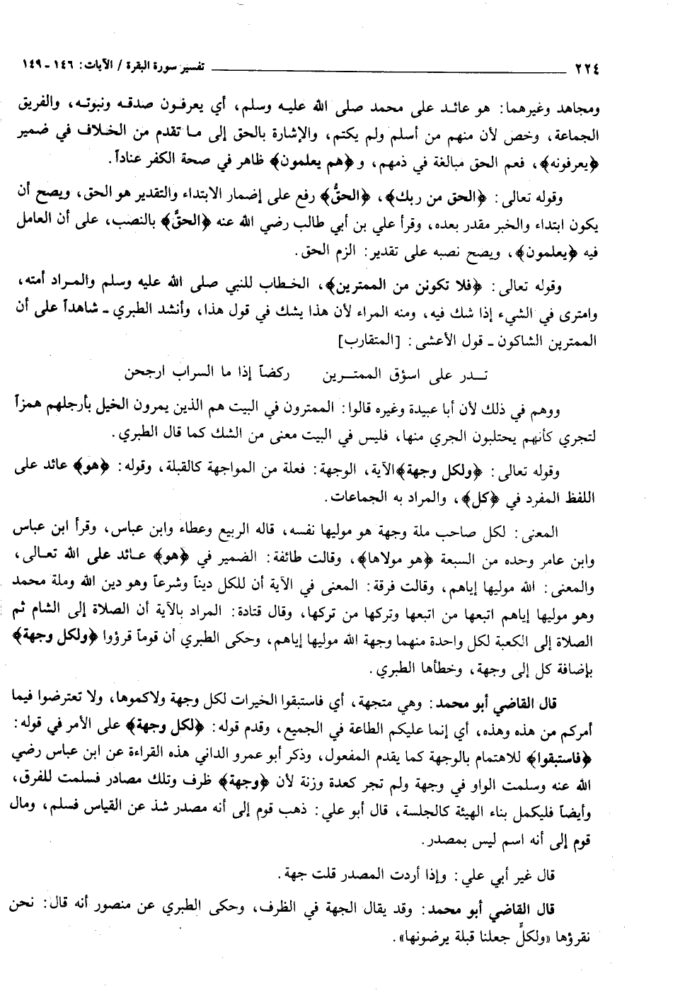 المعنى: لكل صاحب ملة وجهة هو موليها نفسه، قاله الربيع وعطاء وابن عباس، وقرأ ابن عباس وابن عامر وحده من السبعة هو مولاها، وقالت طائفة: الضمير في وَ/ ١٤٨