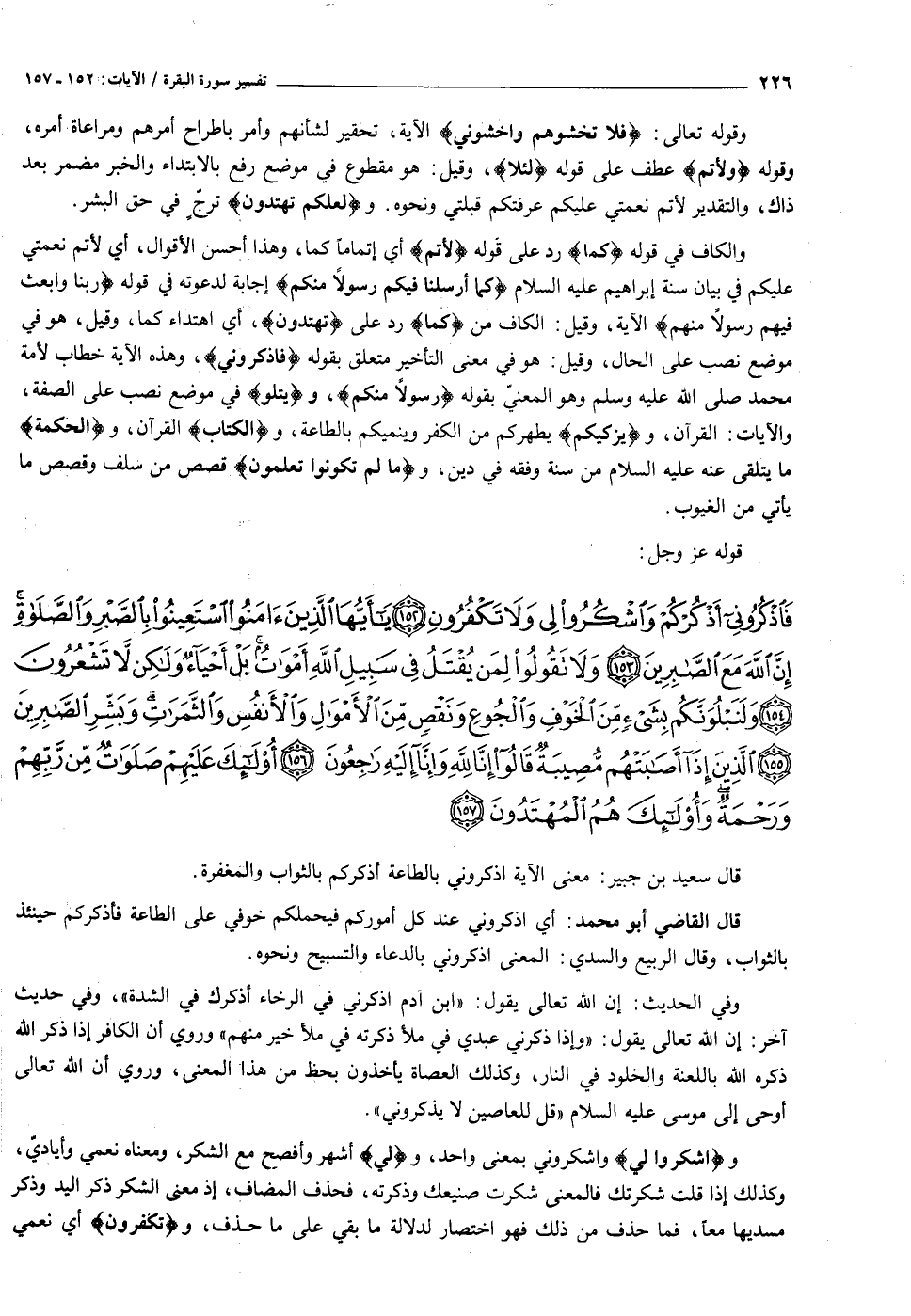 فَاذْكُرُونِي أَذْكُرْكُمْ وَاشْكُرُوا لِي وَلا تَكْفُرُونِ (١٥٢) يا أَيُّهَا الَّذِينَ آمَنُوا اسْتَعِينُوا بِالصَّبْرِ وَالصَّلاةِ إِنَّ اللَّهَ مَعَ الصَّابِرِينَ (١٥٣) وَلا تَقُولُوا لِمَنْ يُقْتَلُ فِي سَبِيلِ اللَّهِ أَمْواتٌ بَلْ أَحْياءٌ وَلكِنْ لا تَشْعُرُونَ (١٥٤) وَلَنَبْلُوَنَّكُمْ بِشَيْءٍ مِنَ الْخَوْفِ وَالْجُوعِ وَنَقْصٍ مِنَ الْأَمْوالِ وَالْأَنْفُسِ وَالثَّمَراتِ وَبَشِّرِ الصَّابِرِينَ (١٥٥) الَّذِينَ إِذا أَصابَتْهُمْ مُصِيبَةٌ قالُوا إِنَّا لِلَّهِ وَإِنَّا إِلَيْهِ راجِعُونَ (١٥٦)