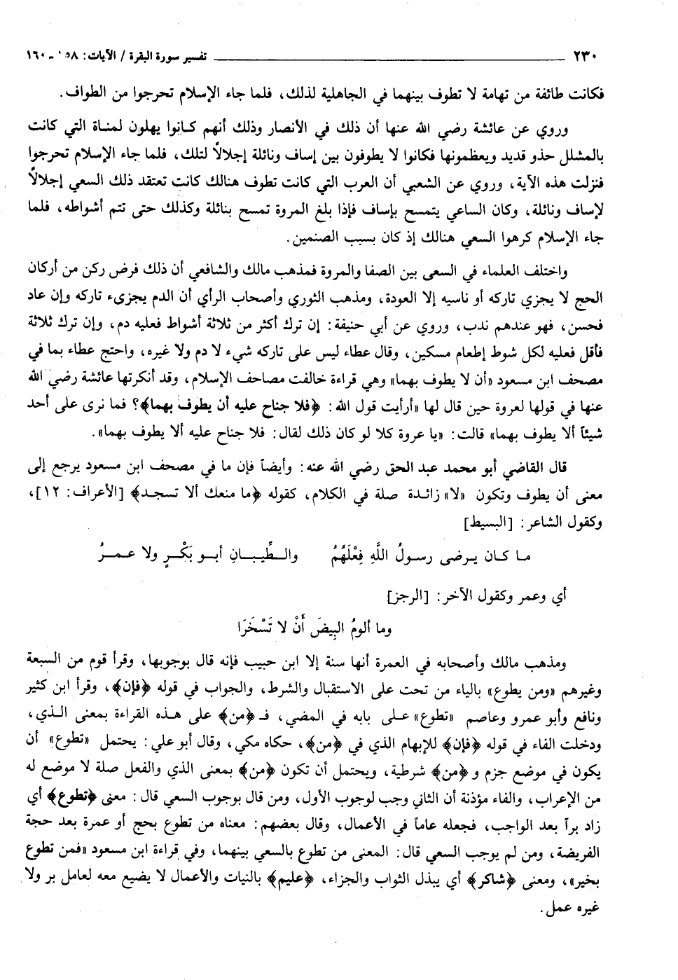 واختلف العلماء في السعى بين الصفا والمروة فمذهب مالك والشافعي أن ذلك فرض ركن من أركان الحج لا يجزي تاركه أو ناسيه إلا العودة، ومذهب الثوري وأصحاب الرأي أن الدم يجزىء تاركه وإن عاد فحسن، فهو عندهم ندب، وروي عن أبي حنيفة: إن ترك أكثر من ثلاثة أشواط فعليه دم، وإن ترك ثلاثة فأقل فعليه لكل شوط إطعام مسكين، وقال عطاء ليس على تاركه شيء لا دم ولا غيره، واحتج عطاء بما في مصحف ابن مسعود «أن لا يطوف بهما» وهي قراءة خالفت مصاحف الإسلام، وقد أنكرتها عائشة رضي الله عنها في قولها لعروة حين قال لها «أرأيت قول الله: فَلا جُناحَ عَلَيْهِ أَنْ يَطَّوَّفَ بِهِما؟ فما نرى على أحد شيئا ألا يطوف بهما» قالت: «يا عروة كلا لو كان ذلك لقال: فلا جناح عليه ألا يطوف بهما» .