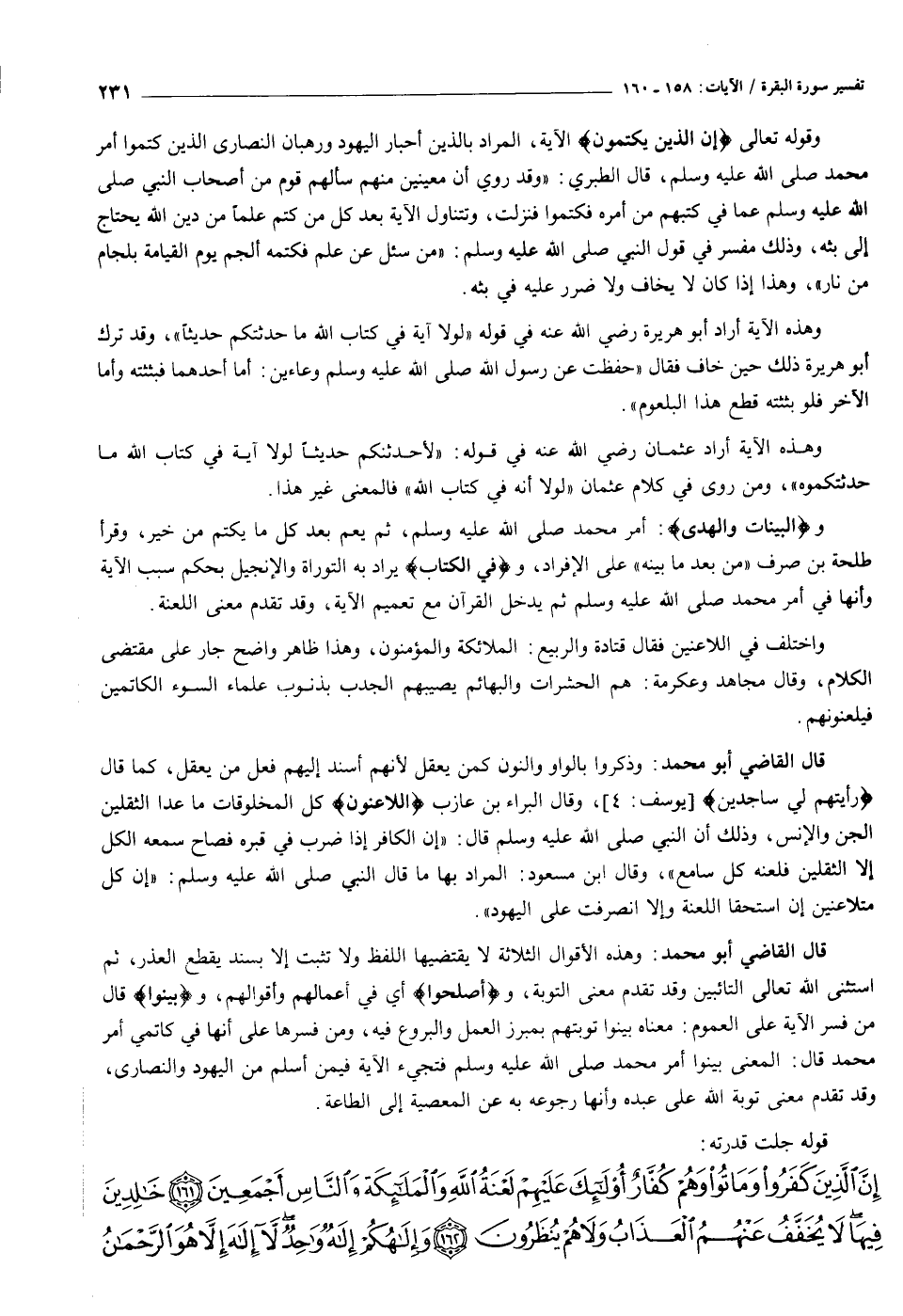 وقوله تعالى إِنَّ الَّذِينَ يَكْتُمُونَ الآية، المراد بالذين أحبار اليهود ورهبان النصارى الذين كتموا أمر محمد صلى الله عليه وسلم، قال الطبري: «وقد روي أن معينين منهم سألهم قوم من أصحاب النبي صلى الله عليه وسلم عما في كتبهم من أمره فكتموا فنزلت، وتتناول الآية بعد كل من كتم علما من دين الله يحتاج إلى بثه، وذلك مفسر في قول النبي صلى الله عليه وسلم: «من سئل عن علم فكتمه ألجم يوم القيامة بلجام من نار» ، وهذا إذا كان لا يخاف ولا ضرر عليه في بثه.
