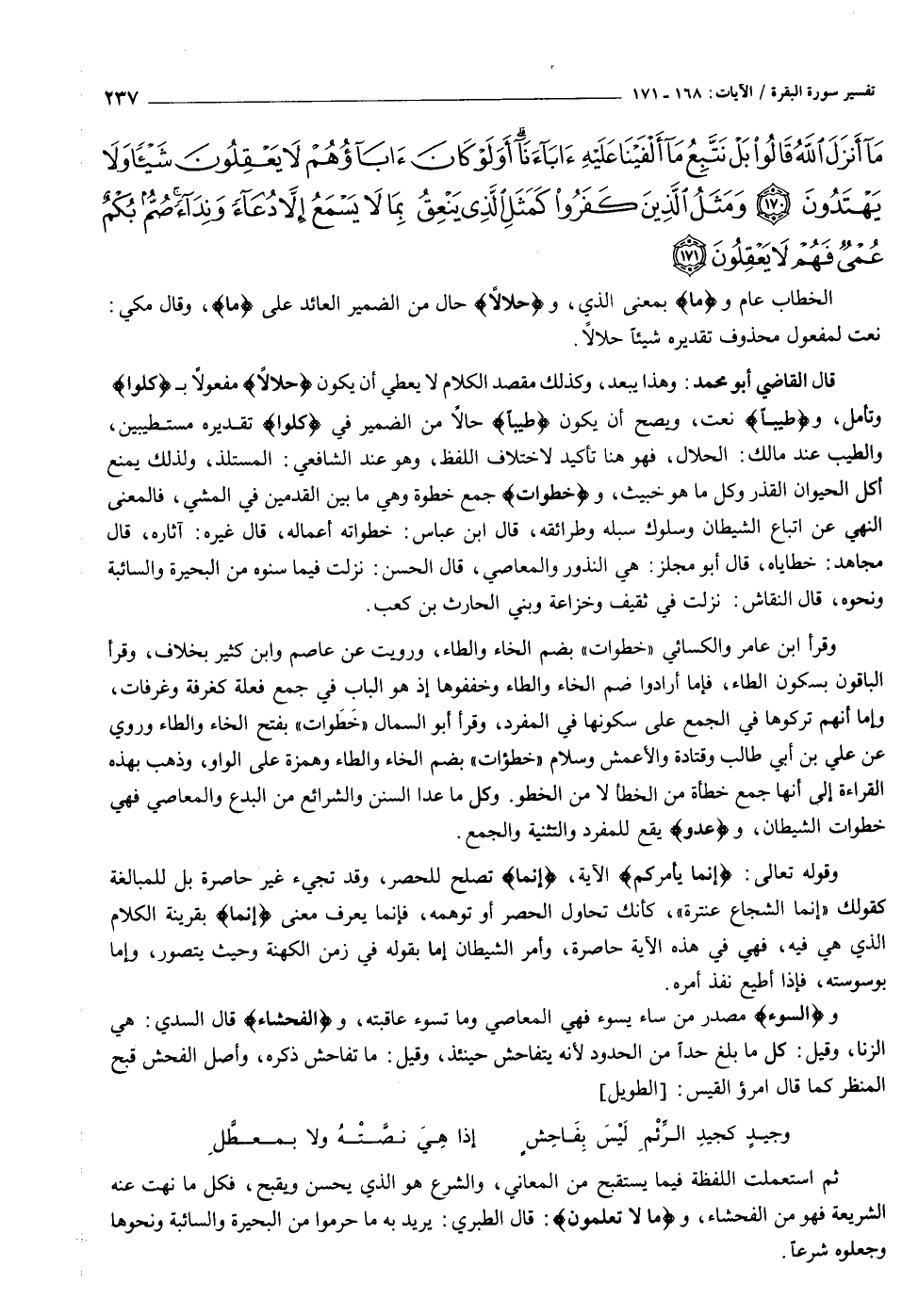 قال القاضي أبو محمد: وهذا يبعد، وكذلك مقصد الكلام لا يعطي أن يكون حَلالًا مفعولا ب كُلُوا وتأمل، وطَيِّباً نعت، ويصح أن يكون طَيِّباً حالا من الضمير في كُلُوا تقديره مستطيبين، والطيب عند مالك: الحلال، فهو هنا تأكيد لاختلاف اللفظ، وهو عند الشافعي: المستلذ، ولذلك يمنع أكل الحيوان القذر وكل ما هو خبيث، وخُطُواتِ جمع خطوة وهي ما بين القدمين في المشي، فالمعنى النهي عن اتباع الشيطان وسلوك سبله وطرائقه، قال ابن عباس: خطواته أعماله، قال غيره: آثاره، قال مجاهد: خطاياه، قال أبو مجلز: هي النذور والمعاصي، قال الحسن: نزلت فيما سنوه من البحيرة والسائبة ونحوه، قال النقاش: نزلت في ثقيف وخزاعة وبني الحارث بن كعب.