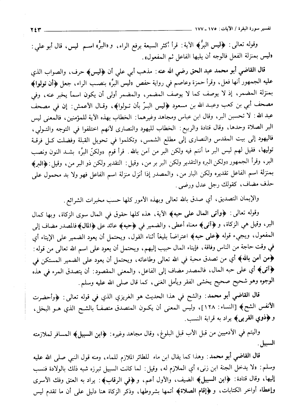 قال القاضي أبو محمد عبد الحق رضي الله عنه: مذهب أبي علي أن لَيْسَ حرف، والصواب الذي عليه الجمهور أنها فعل، وقرأ حمزة وعاصم في رواية حفص «ليس البرّ» بنصب الراء، جعل أَنْ تُوَلُّوا بمنزلة المضمر، إذ لا يوصف كما لا يوصف المضمر، والمضمر أولى أن يكون اسما يخبر عنه، وفي مصحف أبي بن كعب وعبد الله بن مسعود ليس البرّ بأن تولوا، وقال الأعمش: إن في مصحف عبد الله: لا تحسبن البر، وقال ابن عباس ومجاهد وغيرهما: الخطاب بهذه الآية للمؤمنين، فالمعنى ليس البر الصلاة وحدها، وقال قتادة والربيع: الخطاب لليهود والنصارى لأنهم اختلفوا في التوجه والتولي، فاليهود إلى بيت المقدس والنصارى إلى مطلع الشمس، وتكلموا في تحويل القبلة وفضلت كل فرقة توليها، فقيل لهم ليس البر ما أنتم فيه ولكن البر من آمن بالله. قرأ قوم «ولكنّ البرّ» بشد النون ونصب البر، وقرأ الجمهور «ولكن البر» والتقدير ولكن البر بر من، وقيل: التقدير ولكن ذو البر من، وقيل: الْبِرَّ بمنزلة اسم الفاعل تقديره ولكن البار من، والمصدر إذا أنزل منزلة اسم الفاعل فهو ولا بد محمول على حذف مضاف، كقولك رجل عدل ورضى.