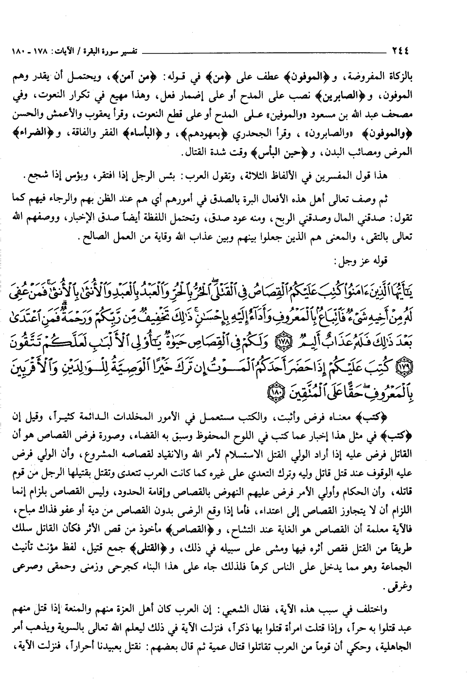 يا أَيُّهَا الَّذِينَ آمَنُوا كُتِبَ عَلَيْكُمُ الْقِصاصُ فِي الْقَتْلى الْحُرُّ بِالْحُرِّ وَالْعَبْدُ بِالْعَبْدِ وَالْأُنْثى بِالْأُنْثى فَمَنْ عُفِيَ لَهُ مِنْ أَخِيهِ شَيْءٌ فَاتِّباعٌ بِالْمَعْرُوفِ وَأَداءٌ إِلَيْهِ بِإِحْسانٍ ذلِكَ تَخْفِيفٌ مِنْ رَبِّكُمْ وَرَحْمَةٌ فَمَنِ اعْتَدى بَعْدَ ذلِكَ فَلَهُ عَذابٌ أَلِيمٌ (١٧٨) وَلَكُمْ فِي الْقِصاصِ حَياةٌ يا أُولِي الْأَلْبابِ لَعَلَّكُمْ تَتَّقُونَ (١٧٩) كُتِبَ عَلَيْكُمْ إِذا حَضَرَ أَحَدَكُمُ الْمَوْتُ إِنْ تَرَكَ خَيْراً الْوَصِيَّةُ لِلْوالِدَيْنِ وَالْأَقْرَبِينَ بِالْمَعْرُوفِ حَقًّا عَلَى الْمُتَّقِينَ (١٨٠)
