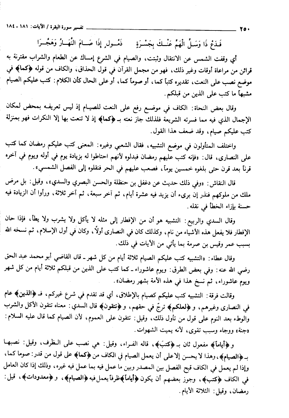 أي وقفت الشمس عن الانتقال وثبتت، والصيام في الشرع إمساك عن الطعام والشراب مقترنة به قرائن من مراعاة أوقات وغير ذلك، فهو من مجمل القرآن في قول الحذاق، والكاف من قوله كَما في موضع نصب على النعت، تقديره كتبا كما، أو صوما كما، أو على الحال كأن الكلام: كتب عليكم الصيام مشبها ما كتب على الذين من قبلكم.