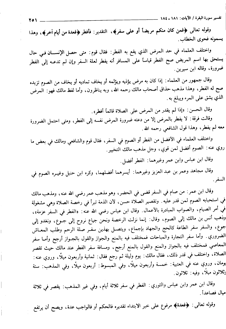 وقال ابن عمر: من صام في السفر قضى في الحضر، وهو مذهب عمر رضي الله عنه، ومذهب مالك في استحبابه الصوم لمن قدر عليه. وتقصير الصلاة حسن، لأن الذمة تبرأ في رخصة الصلاة وهي مشغولة في أمر الصيام، والصواب المبادرة بالأعمال. وقال ابن عباس رضي الله عنه: «الفطر في السفر عزمة» ، وذهب أنس بن مالك إلى الصوم، وقال: إنما نزلت الرخصة ونحن جياع نروح إلى جوع، ونغدو إلى جوع، والسفر سفر الطاعة كالحج والجهاد بإجماع، ويتصل بهذين سفر صلة الرحم وطلب المعاش الضروري. وأما سفر التجارة والمباحات فمختلف فيه بالمنع والجواز والقول بالجواز أرجح وأما سفر المعاصي فمختلف فيه بالجواز والمنع والقول بالمنع أرجح، ومسافة سفر الفطر عند مالك حيث تقصر الصلاة، واختلف في قدر ذلك، فقال مالك: يوم وليلة ثم رجع فقال: ثمانية وأربعون ميلا، وروي عنه: