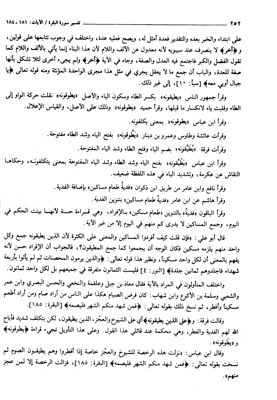 وقالت فرقة: وعَلَى الَّذِينَ يُطِيقُونَهُ أي على الشيوخ والعجّز، الذين يطيقون، لكن بتكلف شديد فأباح الله لهم الفدية والفطر، وهي محكمة عند قائلي هذا القول. وعلى هذا التأويل تجيء قراءة يطوقونه و «يطوقونه» .