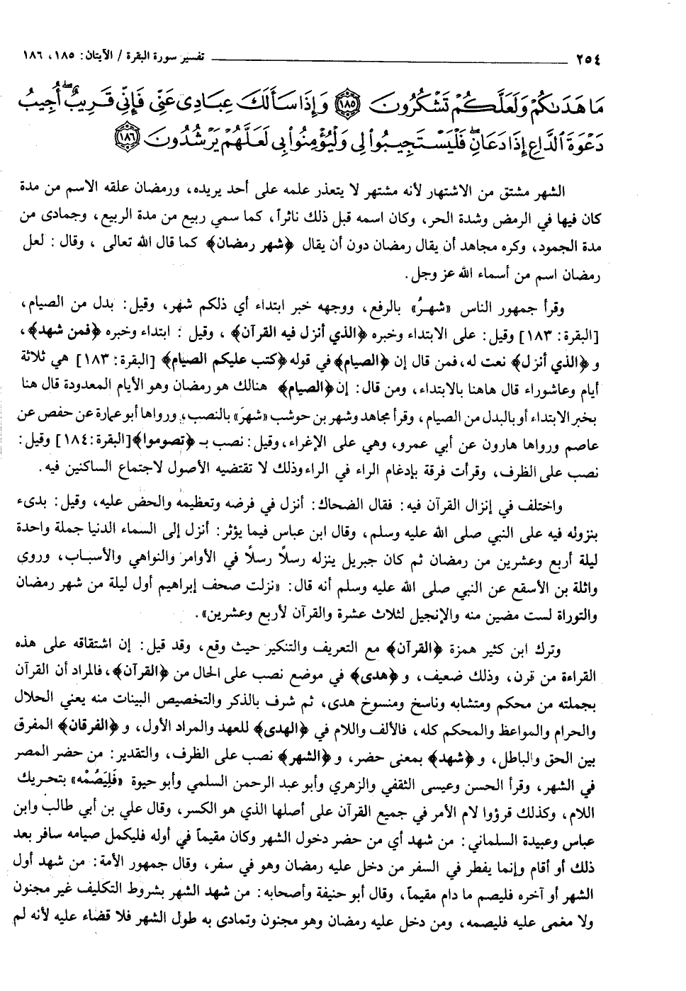 شَهْرُ رَمَضانَ الَّذِي أُنْزِلَ فِيهِ الْقُرْآنُ هُدىً لِلنَّاسِ وَبَيِّناتٍ مِنَ الْهُدى وَالْفُرْقانِ فَمَنْ شَهِدَ مِنْكُمُ الشَّهْرَ فَلْيَصُمْهُ وَمَنْ كانَ مَرِيضاً أَوْ عَلى سَفَرٍ فَعِدَّةٌ مِنْ أَيَّامٍ أُخَرَ يُرِيدُ اللَّهُ بِكُمُ الْيُسْرَ وَلا يُرِيدُ بِكُمُ الْعُسْرَ وَلِتُكْمِلُوا الْعِدَّةَ وَلِتُكَبِّرُوا اللَّهَ عَلى ما هَداكُمْ وَلَعَلَّكُمْ تَشْكُرُونَ (١٨٥) وَإِذا سَأَلَكَ عِبادِي عَنِّي فَإِنِّي قَرِيبٌ أُجِيبُ دَعْوَةَ الدَّاعِ إِذا دَعانِ فَلْيَسْتَجِيبُوا لِي وَلْيُؤْمِنُوا بِي لَعَلَّهُمْ يَرْشُدُونَ (١٨٦)