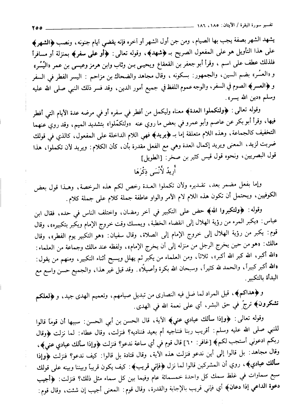 وقوله تعالى: وَلِتُكْمِلُوا الْعِدَّةَ معناه وليكمل من أفطر في سفره أو في مرضه عدة الأيام التي أفطر فيها، وقرأ أبو بكر عن عاصم وأبو عمرو في بعض ما روي عنه «ولتكمّلوا» بتشديد الميم، وقد روي عنهما التخفيف كالجماعة، وهذه اللام متعلقة إما ب يُرِيدُ فهي اللام الداخلة على المفعول، كالذي في قولك ضربت لزيد، المعنى ويريد إكمال العدة وهي مع الفعل مقدرة بأن، كأن الكلام: ويريد لأن تكملوا، هذا قول البصريين، ونحوه قول قيس كثير بن صخر: [الطويل] أريد لأنسى ذكرها وإما بفعل مضمر بعد، تقديره ولأن تكملوا العدة رخص لكم هذه الرخصة، وهذا قول بعض الكوفيين، ويحتمل أن تكون هذه اللام لام الأمر والواو عاطفة جملة كلام على جملة كلام.
