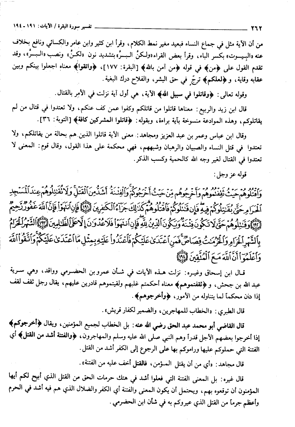 وَاقْتُلُوهُمْ حَيْثُ ثَقِفْتُمُوهُمْ وَأَخْرِجُوهُمْ مِنْ حَيْثُ أَخْرَجُوكُمْ وَالْفِتْنَةُ أَشَدُّ مِنَ الْقَتْلِ وَلا تُقاتِلُوهُمْ عِنْدَ الْمَسْجِدِ الْحَرامِ حَتَّى يُقاتِلُوكُمْ فِيهِ فَإِنْ قاتَلُوكُمْ فَاقْتُلُوهُمْ كَذلِكَ جَزاءُ الْكافِرِينَ (١٩١) فَإِنِ انْتَهَوْا فَإِنَّ اللَّهَ غَفُورٌ رَحِيمٌ (١٩٢) وَقاتِلُوهُمْ حَتَّى لا تَكُونَ فِتْنَةٌ وَيَكُونَ الدِّينُ لِلَّهِ فَإِنِ انْتَهَوْا فَلا عُدْوانَ إِلاَّ عَلَى الظَّالِمِينَ (١٩٣) الشَّهْرُ الْحَرامُ بِالشَّهْرِ الْحَرامِ وَالْحُرُماتُ قِصاصٌ فَمَنِ اعْتَدى عَلَيْكُمْ فَاعْتَدُوا عَلَيْهِ بِمِثْلِ مَا اعْتَدى عَلَيْكُمْ وَاتَّقُوا اللَّهَ وَاعْلَمُوا أَنَّ اللَّهَ مَعَ الْمُتَّقِينَ (١٩٤)