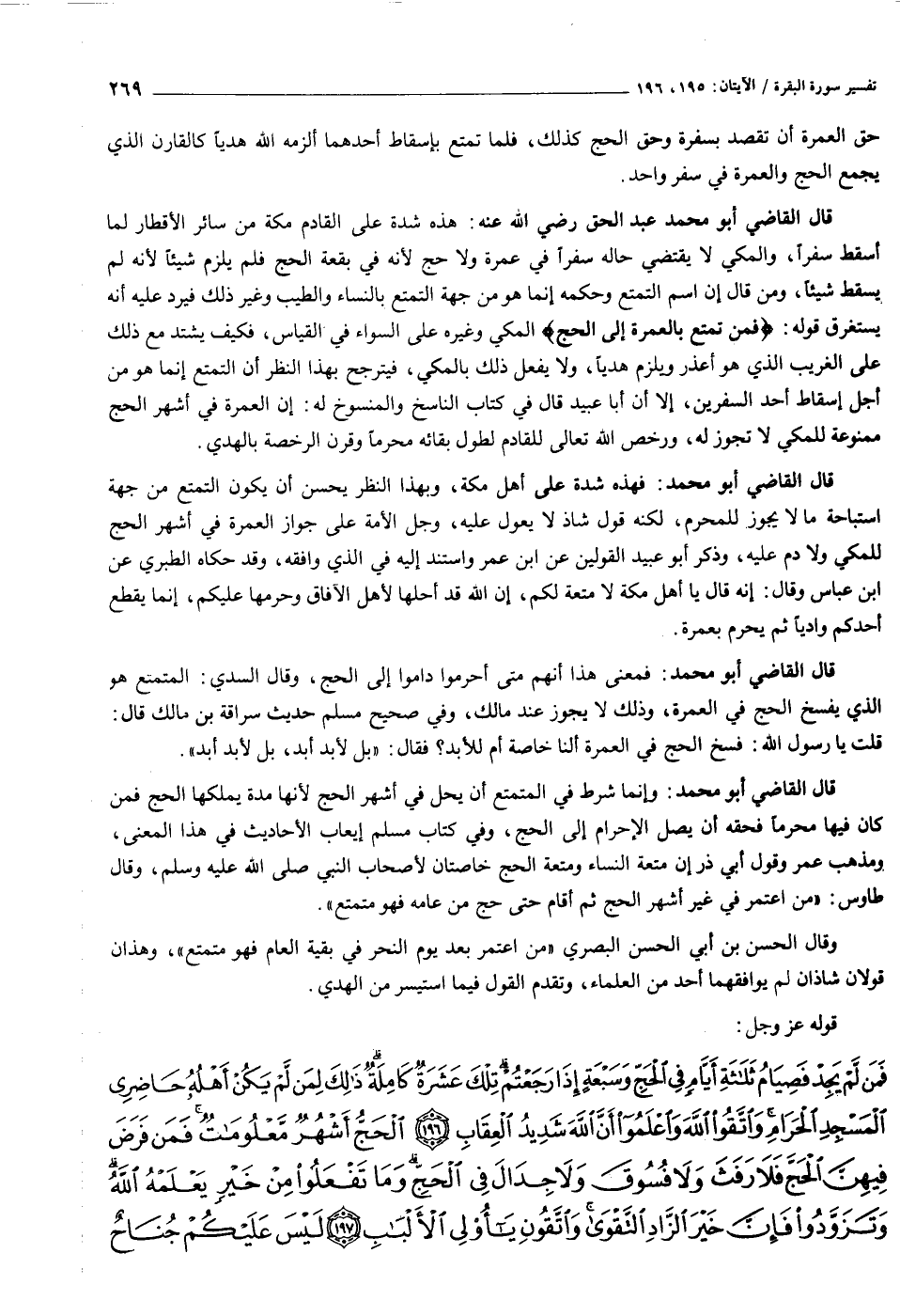 قال القاضي أبو محمد عبد الحق رضي الله عنه: هذه شدة على القادم مكة من سائر الأقطار لما أسقط سفرا، والمكي لا يقتضي حاله سفرا في عمرة ولا حج لأنه في بقعة الحج فلم يلزم شيئا لأنه لم يسقط شيئا، ومن قال إن اسم التمتع وحكمه إنما هو من جهة التمتع بالنساء والطيب وغير ذلك فيرد عليه أنه يستغرق قوله: فَمَنْ تَمَتَّعَ بِالْعُمْرَةِ إِلَى الْحَجِّ المكي وغيره على السواء في القياس، فكيف يشتد مع ذلك على الغريب الذي هو أعذر ويلزم هديا، ولا يفعل ذلك بالمكي، فيترجح بهذا النظر أن التمتع إنما هو من أجل إسقاط أحد السفرين، إلا أن أبا عبيد قال في كتاب الناسخ والمنسوخ له: إن العمرة في أشهر الحج ممنوعة للمكي لا تجوز له، ورخص الله تعالى للقادم لطول بقائه محرما وقرن الرخصة بالهدي.
