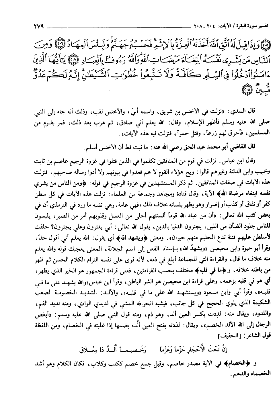 وقال ابن عباس: نزلت في قوم من المنافقين تكلموا في الذين قتلوا في غزوة الرجيع عاصم بن ثابت وخبيب وابن الدثنة وغيرهم قالوا: ويح هؤلاء القوم لا هم قعدوا في بيوتهم ولا أدوا رسالة صاحبهم، فنزلت هذه الآيات في صفات المنافقين. ثم ذكر المستشهدين في غزوة الرجيع في قوله: وَمِنَ النَّاسِ مَنْ يَشْرِي نَفْسَهُ ابْتِغاءَ مَرْضاتِ اللَّهِ الآية، وقال قتادة ومجاهد وجماعة من العلماء: نزلت هذه الآيات في كل مبطن كفر أو نفاق أو كذب أو إضرار وهو يظهر بلسانه خلاف ذلك، فهي عامة، وهي تشبه ما ورد في الترمذي أن في بعض كتب الله تعالى: «أن من عباد الله قوما ألسنتهم أحلى من العسل وقلوبهم أمر من الصبر، يلبسون للناس جلود الضأن من اللين، يجترون الدنيا بالدين، يقول الله تعالى: أبي يغترون وعلي يجترون؟ حلفت لأسلطن عليهم فتنة تدع الحليم منهم حيران» . ومعنى وَيُشْهِدُ اللَّهَ أي يقول: الله يعلم أني أقول حقا، وقرأ أبو حيوة وابن محيصن «ويشهد الله» بإسناد الفعل إلى اسم الجلالة، المعنى يعجبك قوله والله يعلم منه خلاف ما قال، والقراءة التي للجماعة أبلغ في ذمه، لأنه قوى على نفسه التزام الكلام الحسن ثم ظهر من باطنه خلافه، وما فِي قَلْبِهِ مختلف بحسب القراءتين، فعلى قراءة الجمهور هو الخير الذي يظهر، أي هو في قلبه بزعمه، وعلى قراءة ابن محيصن هو الشر الباطن، وقرأ ابن عباس «والله يشهد على ما في قلبه» ، وقرأ أبي وابن مسعود «ويستشهد الله على ما في قلبه» ، والألد: الشديد الخصومة الصعب الشكيمة الذي يلوي الحجج في كل جانب، فيشبه انحرافه المشي في لديدي الوادي، ومنه لديد الفم، واللدود، ويقال منه: لددت بكسر العين ألد، وهو ذم، ومنه قول النبي صلى الله عليه وسلم: «أبغض الرجال إلى الله الألد الخصم» ، ويقال: لددته بفتح العين ألده بضمها إذا غلبته في الخصام، ومن اللفظة قول الشاعر: [الخفيف]