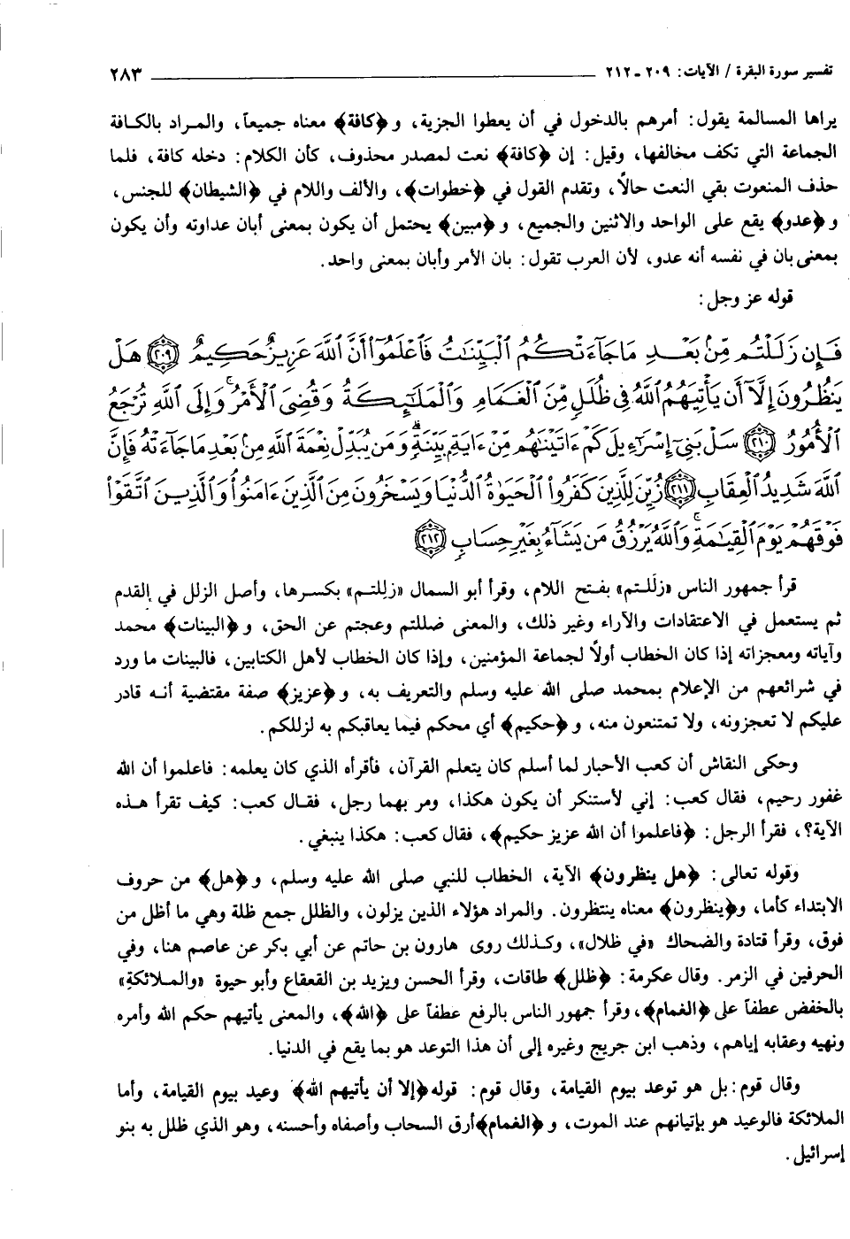 فَإِنْ زَلَلْتُمْ مِنْ بَعْدِ ما جاءَتْكُمُ الْبَيِّناتُ فَاعْلَمُوا أَنَّ اللَّهَ عَزِيزٌ حَكِيمٌ (٢٠٩) هَلْ يَنْظُرُونَ إِلاَّ أَنْ يَأْتِيَهُمُ اللَّهُ فِي ظُلَلٍ مِنَ الْغَمامِ وَالْمَلائِكَةُ وَقُضِيَ الْأَمْرُ وَإِلَى اللَّهِ تُرْجَعُ الْأُمُورُ (٢١٠) سَلْ بَنِي إِسْرائِيلَ كَمْ آتَيْناهُمْ مِنْ آيَةٍ بَيِّنَةٍ وَمَنْ يُبَدِّلْ نِعْمَةَ اللَّهِ مِنْ بَعْدِ ما جاءَتْهُ فَإِنَّ اللَّهَ شَدِيدُ الْعِقابِ (٢١١) زُيِّنَ لِلَّذِينَ كَفَرُوا الْحَياةُ الدُّنْيا وَيَسْخَرُونَ مِنَ الَّذِينَ آمَنُوا وَالَّذِينَ اتَّقَوْا فَوْقَهُمْ يَوْمَ الْقِيامَةِ وَاللَّهُ يَرْزُقُ مَنْ يَشاءُ بِغَيْرِ حِسابٍ (٢١٢)